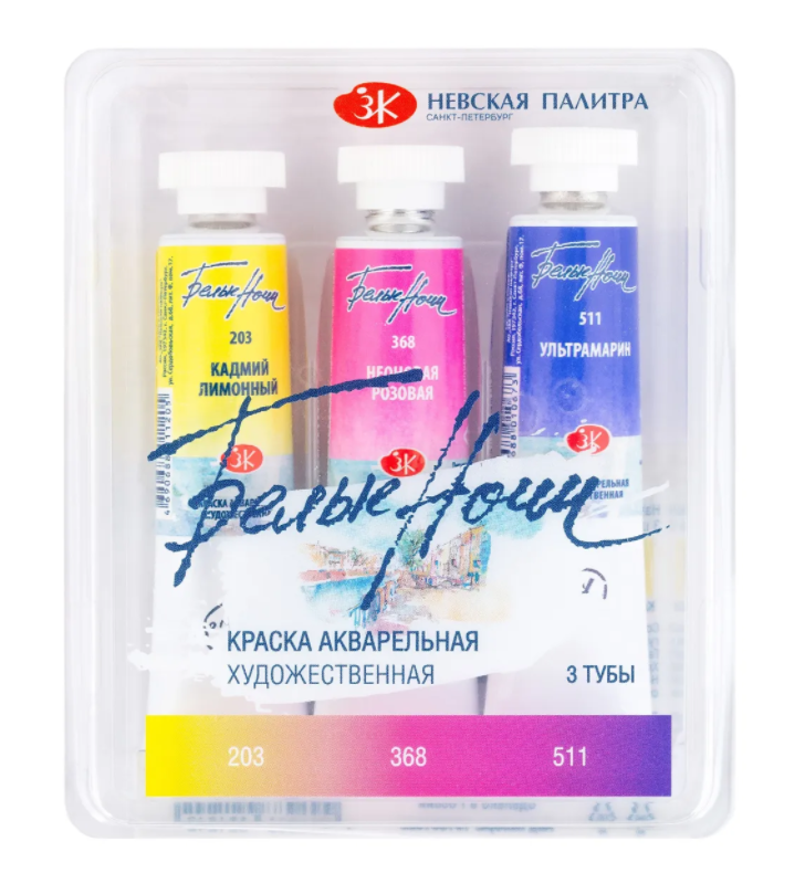Художественные акварельные краски «Белые ночи» изготавливаются из тонкотертых пигментов и связующего из натурального гуммиарабика, признанного лучшим растительным клеем для приготовления художественных водных красок. Максимальная интенсивность цветового тона акварели, сохраняющаяся даже при разбавлении большим количеством воды, достигается благодаря высокой концентрации пигмента и тонкости его перетира. Такие свойства, как яркость и чистота цвета, высокая светостойкость, прекрасная разносимость и прозрачность сделали акварель ЗХК любимыми красками нескольких поколений живописцев.