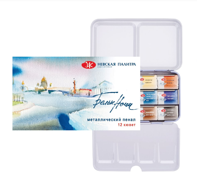 Состав набора оптимально подобран для живописи и скетчей на пленэрах, когда ограниченная палитра классических цветов должна помещаться в компактную коробку и решить множество творческих задач художника. Акварель «Белые ночи» – визитная карточка завода, эти краски признаны профессиональными художниками и считаются одними из лучших среди отечественных акварелей. Акварель «Белые ночи» - краски, выпускаемые в полусухом виде в кюветах по 1,6 миллилитров. Акварель «Белые ночи» изготовлена из высококачественных тонко тертых пигментов и связующего с добавлением гуммиарабика. Цвета хорошо смешиваются между собой и легко размываются водой. Краска обладает высокой светостойкостью. Акварелью в кюветах можно заменить закончившиеся краски из набора, что очень удобно. На сегодняшний день палитра красок «Белые ночи» в кюветах состоит из 92 оттенков, которые представлены поштучно и в наборах. Акварель «Белые ночи» производится заводом художественных красок Невская палитра, расположенным в городе Санкт-Петербурге. Завод уже более 80 лет выпускает продукцию для профессиональных художников и любителей творчества.