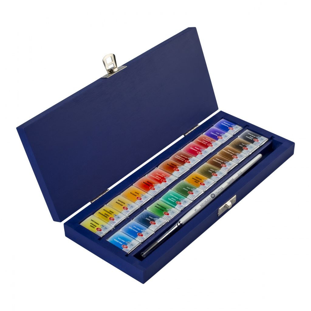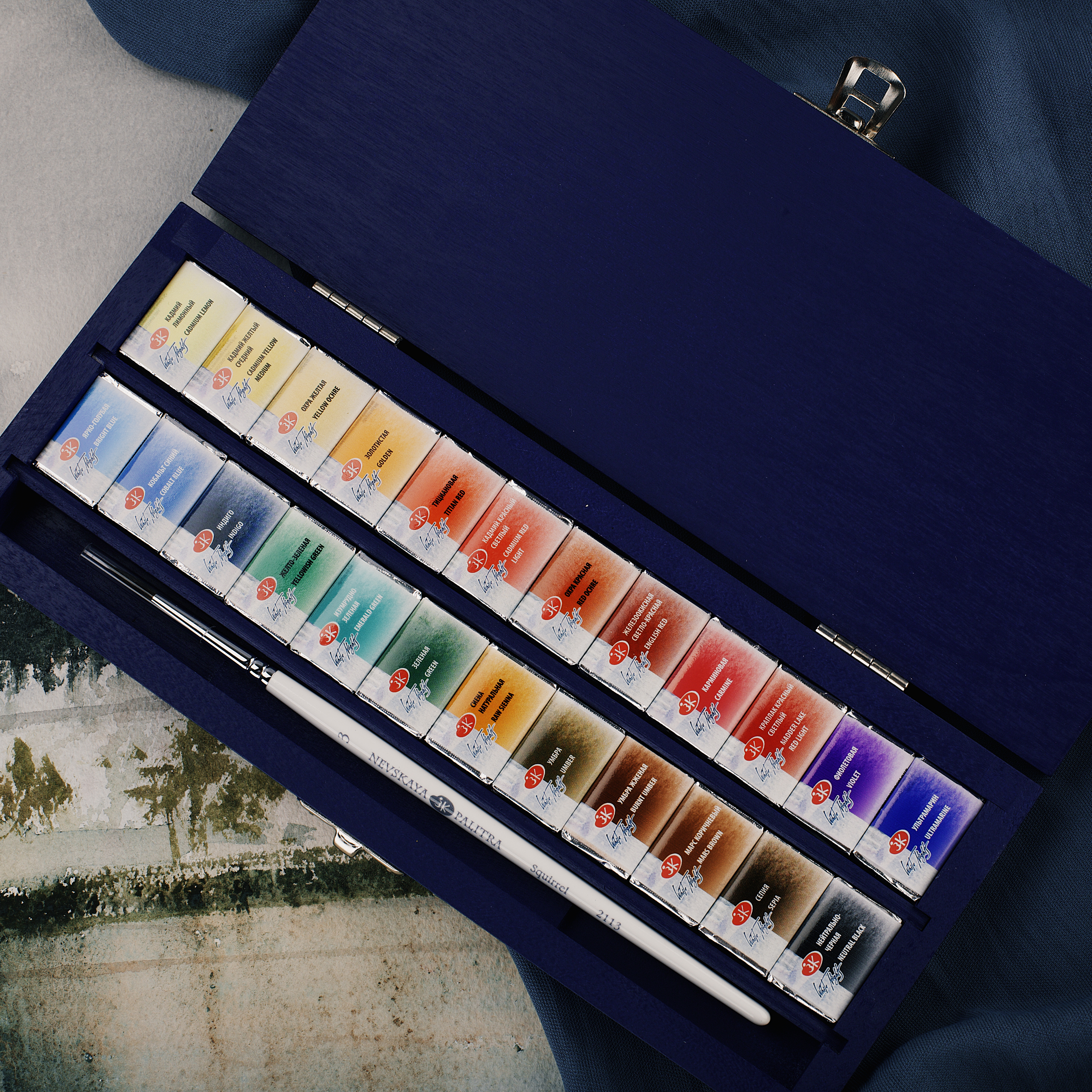 Акварель «Белые ночи» – визитная карточка завода, эти краски признаны профессиональными художниками и считаются одними из лучших среди отечественных акварелей. Акварель «Белые ночи» - краски, выпускаемые в полусухом виде в кюветах по 2,5 миллилитров. Акварель «Белые ночи» изготовлена из высококачественных тонко тертых пигментов и связующего с добавлением гуммиарабика. Цвета хорошо смешиваются между собой и легко размываются водой. Краска обладает высокой светостойкостью. Акварелью в кюветах можно заменить закончившиеся краски из набора, что очень удобно. Цвета в наборе: Кадмий лимонный, Кадмий желтый средний, Охра желтая, Золотистая, Тициановая, Кадмий красный светлый, Охра красная, Железоокисная светло-красная, Карминовая, Краплак красный светлый, Фиолетовая, Ультрамарин, Ярко-голубая, Кобальт синий, Индиго, Желто-зеленая, Изумрудно-зеленая, Зеленая, Сиена натуральная, Умбра, Умбра жженая, Марс коричневый, Сепия, Нейтрально-черная.