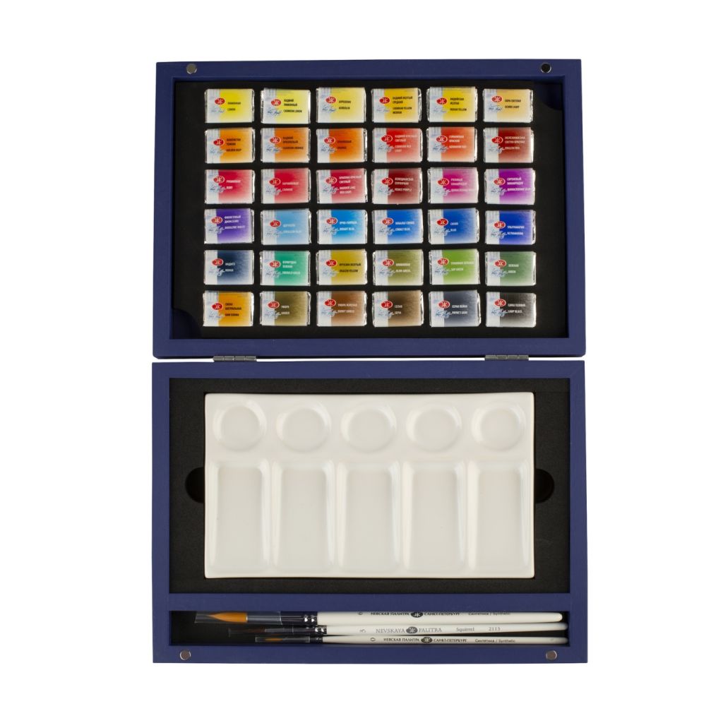 Акварель «Белые ночи» — визитная карточка завода «Невская палитра», эти краски признаны профессиональными художниками и считаются одними из лучших среди отечественных акварелей. Художественные акварельные краски «Белые ночи» изготавливаются из тонкотертых пигментов и связующего из натурального гуммиарабика, признанного лучшим растительным клеем для приготовления художественных водных красок. Максимальная интенсивность цветового тона акварели, сохраняющаяся даже при разбавлении большим количеством воды, достигается благодаря высокой концентрации пигмента и тонкости его перетира. Такие свойства, как яркость и чистота цвета, высокая светостойкость, прекрасная разносимость и прозрачность сделали акварель ЗХК любимыми красками нескольких поколений живописцев. Сбалансированная палитра набора акварели «Белые ночи» состоит из 36 цветов и позволяет решить множество творческих задач художника-акварелиста. Корпус пенала с ярко-синей тонировкой выполнен из качественной натуральной березы. Кюветы надежно располагаются в съемном ложементе. Пенал оснащен магнитным замком. В комплектацию набора входят: кисть синтетика, круглая короткая ручка «Невская палитра» №6 (6 мм), кисть синтетика, круглая короткая ручка «Невская палитра» №0 (1,2 мм), кисть белка, круглая короткая ручка «Невская палитра» №3, фарфоровая палитра, 36 кювет акварели.