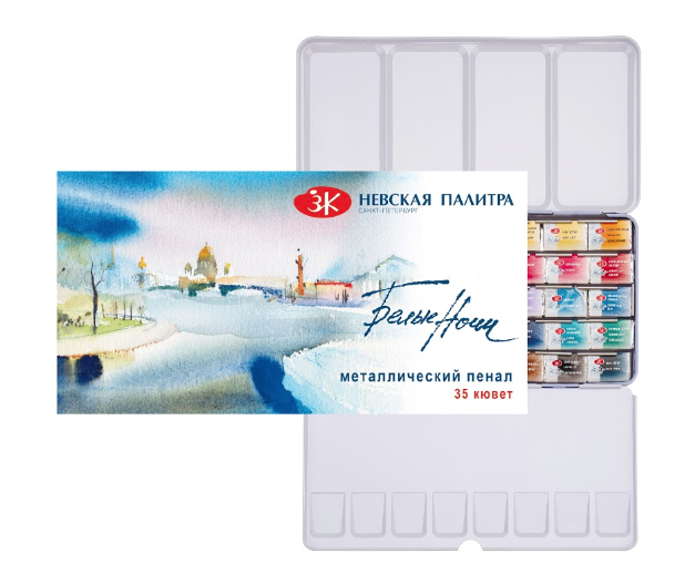 В наборе представлены краски из самых разнообразных пигментов — кобальты, кадмии, хинакридоны, которые позволяют расширить возможности художников в поиске необычных цветовых сочетаний. Акварель «Белые ночи» – визитная карточка завода, эти краски признаны профессиональными художниками и считаются одними из лучших среди отечественных акварелей. Акварель «Белые ночи» - краски, выпускаемые в полусухом виде в кюветах по 1,6 миллилитров. Акварель «Белые ночи» изготовлена из высококачественных тонко тертых пигментов и связующего с добавлением гуммиарабика. Цвета хорошо смешиваются между собой и легко размываются водой. Краска обладает высокой светостойкостью. Акварелью в кюветах можно заменить закончившиеся краски из набора, что очень удобно. На сегодняшний день палитра красок «Белые ночи» в кюветах состоит из 92 оттенков, которые представлены поштучно и в наборах. Акварель «Белые ночи» производится заводом художественных красок Невская палитра, расположенным в городе Санкт-Петербурге. Завод уже более 80 лет выпускает продукцию для профессиональных художников и любителей творчества.