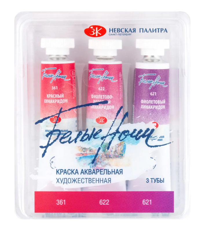 Художественные акварельные краски «Белые ночи» изготавливаются из тонкотертых пигментов и связующего из натурального гуммиарабика, признанного лучшим растительным клеем для приготовления художественных водных красок. Максимальная интенсивность цветового тона акварели, сохраняющаяся даже при разбавлении большим количеством воды, достигается благодаря высокой концентрации пигмента и тонкости его перетира. Такие свойства, как яркость и чистота цвета, высокая светостойкость, прекрасная разносимость и прозрачность сделали акварель ЗХК любимыми красками нескольких поколений живописцев.