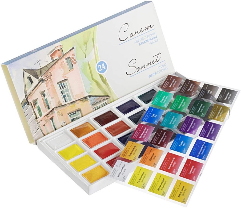 Акварель «Сонет» сочетает в себе основные свойства акварельных красок – прозрачность, интенсивность и чистоту цвета. Все цвета смешиваются между собой, хорошо размываются. Акварелью в кюветах можно заменить закончившиеся краски из набора, что очень удобно. Акварель «Сонет» производится заводом художественных красок Невская палитра, расположенным в городе Санкт-Петербурге. Завод уже более 80 лет выпускает продукцию для профессиональных художников и любителей творчества.