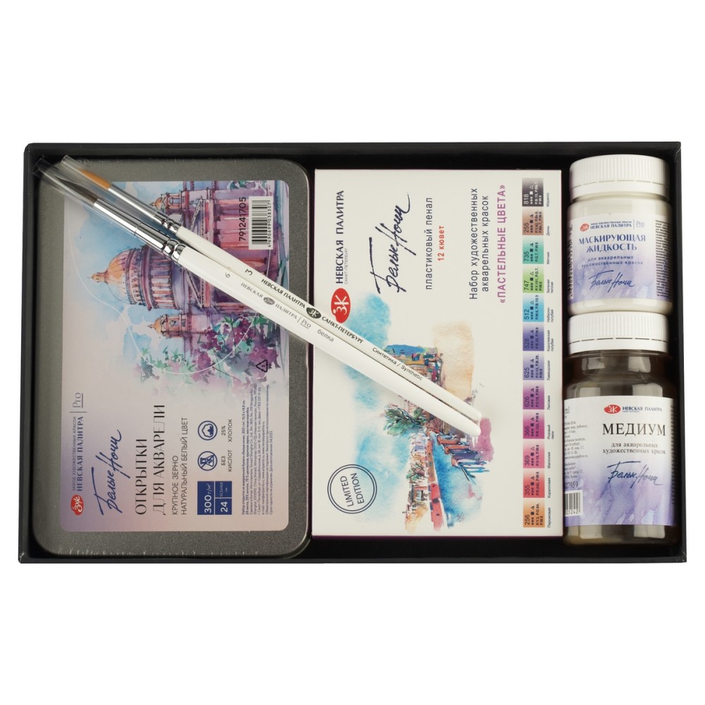 Акварель «Белые ночи» – визитная карточка завода, эти краски признаны профессиональными художниками и считаются одними из лучших среди отечественных акварелей. Акварель «Белые ночи» изготовлена из высококачественных тонко тертых пигментов и связующего с добавлением гуммиарабика. Цвета хорошо смешиваются между собой и легко размываются водой. Краска обладает высокой светостойкостью. Состав набора: 12 кювет по 2,5 мл акварели «Белые ночи» (пастельные цвета); Маскирующая жидкость для акварели «Белые ночи» банка 50 мл.; Медиум для акварели «Белые ночи» банка 100 мл; Набор открыток из акварельной бумаги «Белые ночи», 300 г/кв.м, 10,5 х 14,8 см, 24 листа, 25% хлопок, 75 % целлюлоза, крупное зерно, жестяная коробка; Кисть «Невская палитра» белка круглая, короткая ручка №6; Кисть из синтетики «Невская палитра», круглая, короткая ручка, №3.