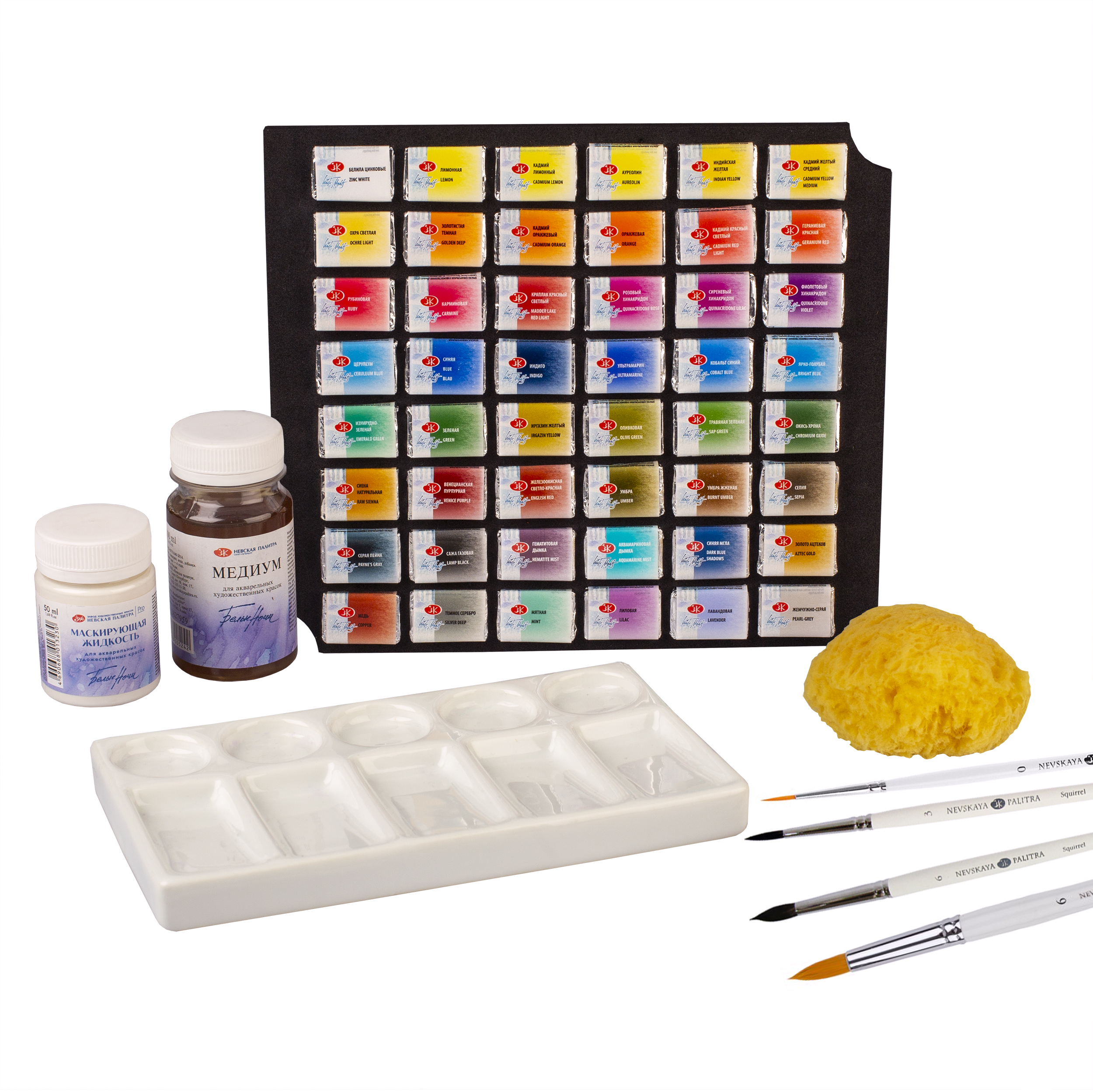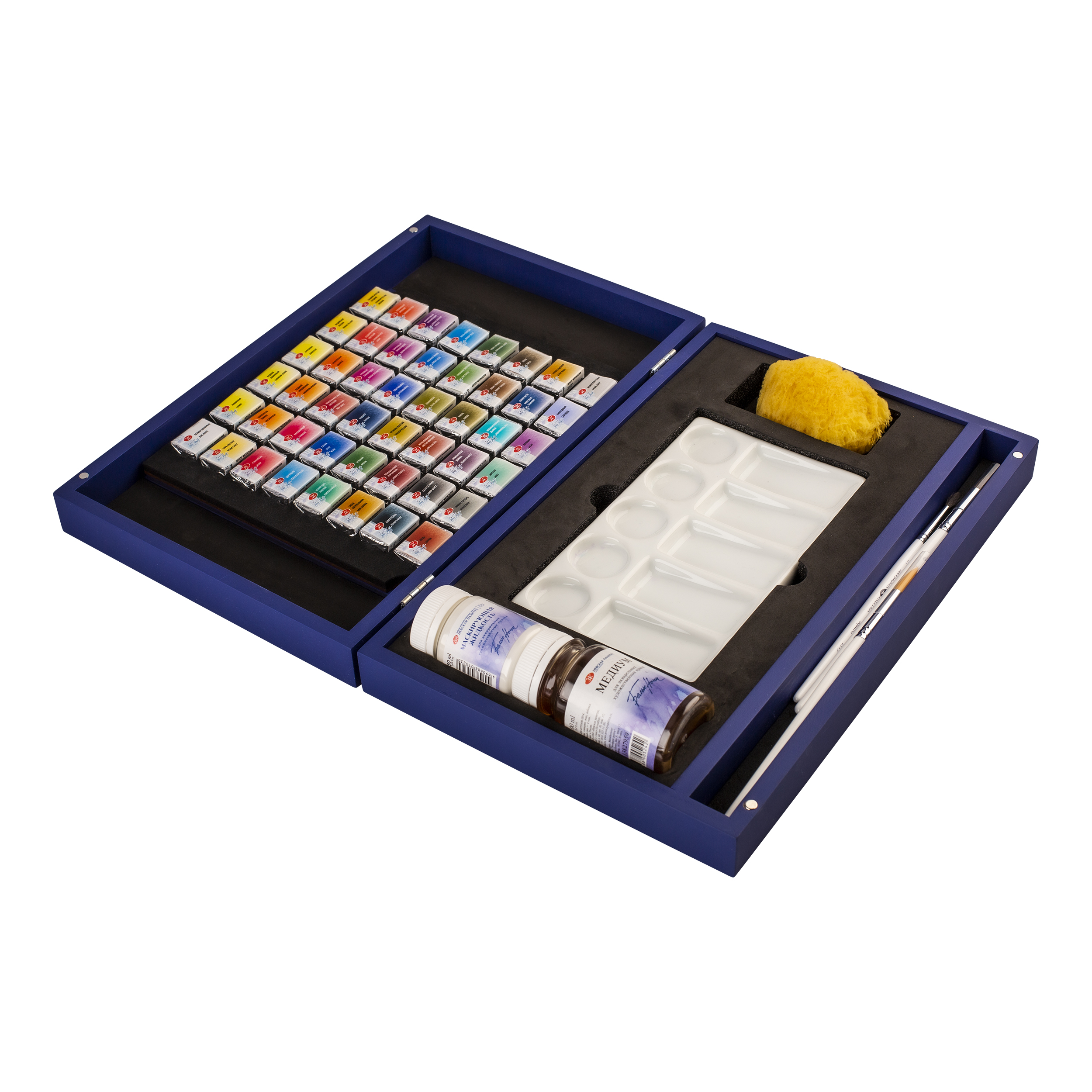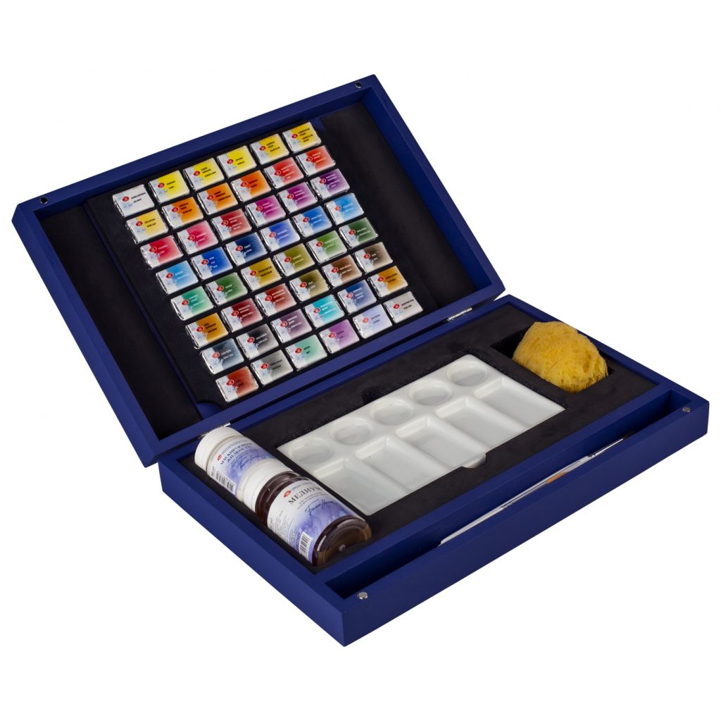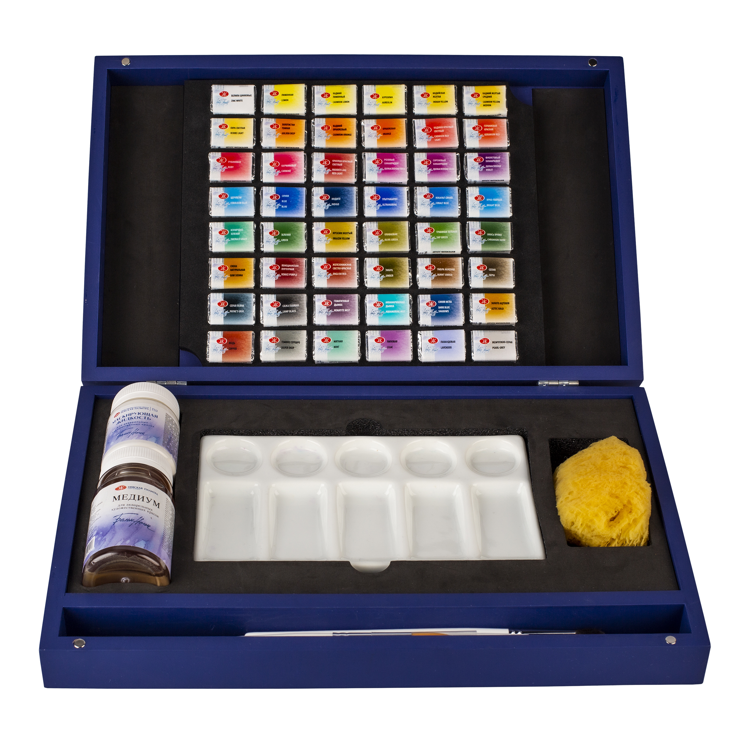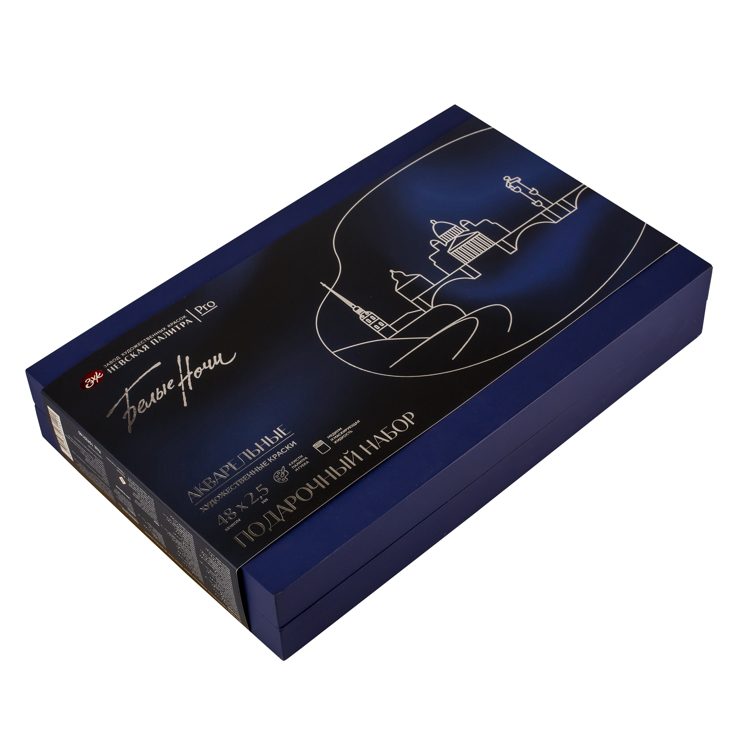 Акварель «Белые ночи» — визитная карточка завода «Невская палитра», эти краски признаны профессиональными художниками и считаются одними из лучших среди отечественных акварелей. Художественные акварельные краски «Белые ночи» изготавливаются из тонкотёртых пигментов и связующего из натурального гуммиарабика, признанного лучшим растительным клеем для приготовления художественных водных красок. Максимальная интенсивность цветового тона акварели, сохраняющаяся даже при разбавлении большим количеством воды, достигается благодаря высокой концентрации пигмента и тонкости его перетира. Такие свойства, как яркость и чистота цвета, высокая светостойкость, прекрасная разносимость и прозрачность сделали акварель ЗХК любимыми красками нескольких поколений живописцев. Набор акварельных красок «Белые ночи» в деревянном пенале станет идеальным подарком для художников-акварелистов. Корпус пенала с ярко-синей тонировкой выполнен из качественной натуральной берёзы. Кюветы надёжно располагаются в съёмном ложементе. Пенал оснащён магнитным замком.
