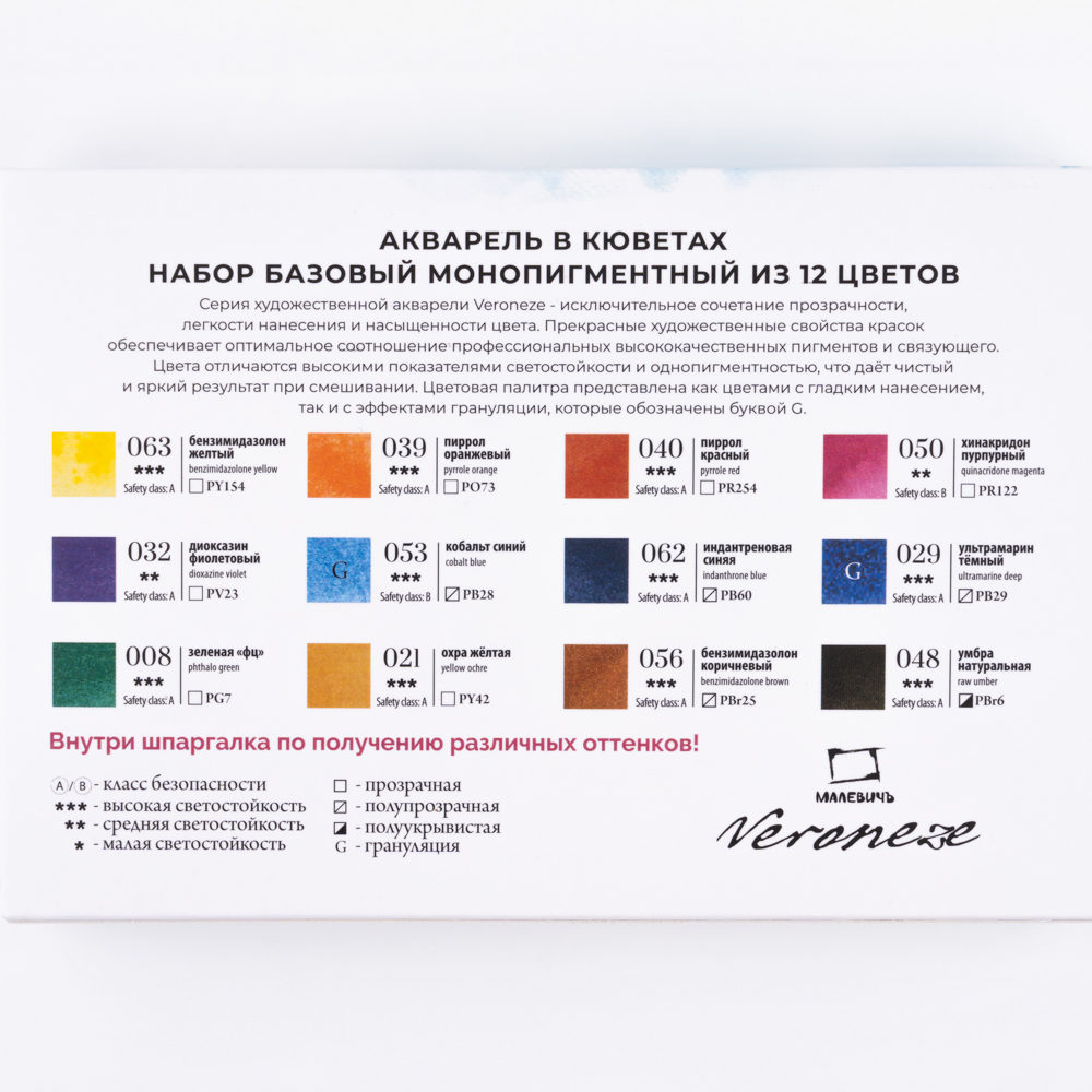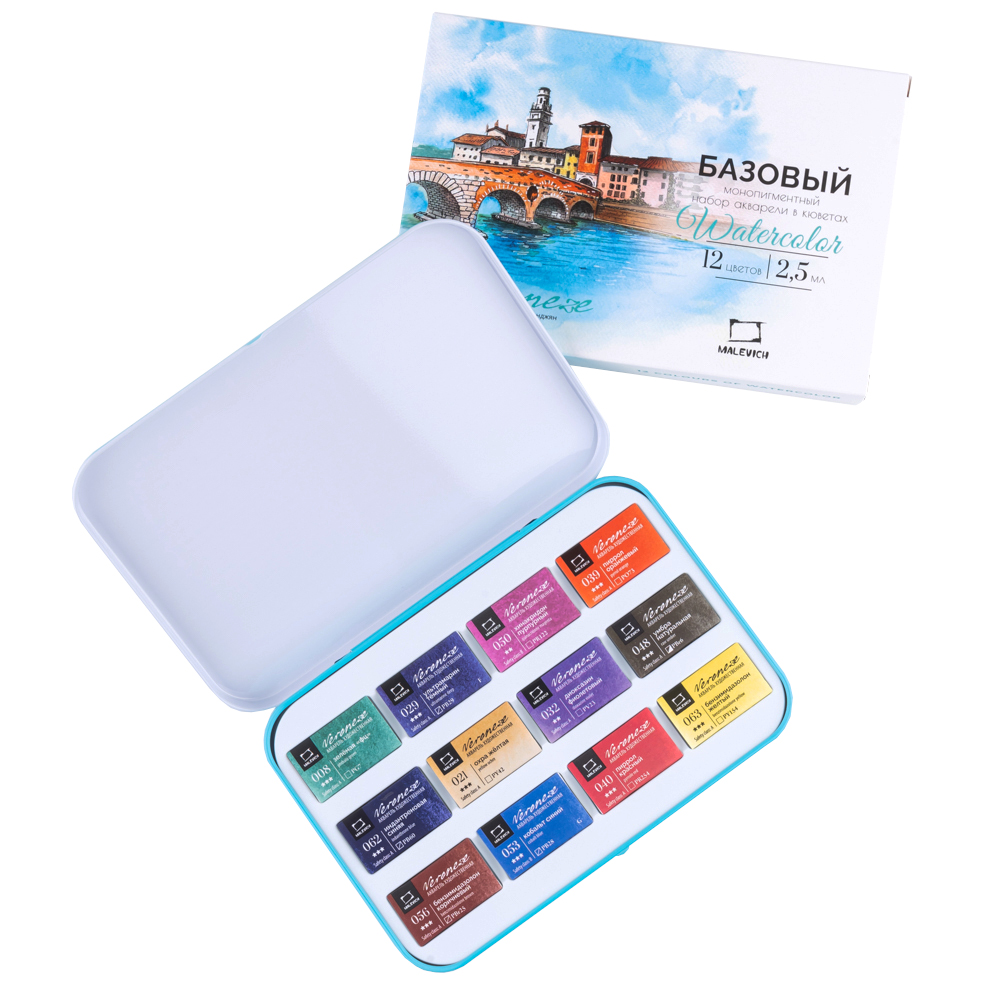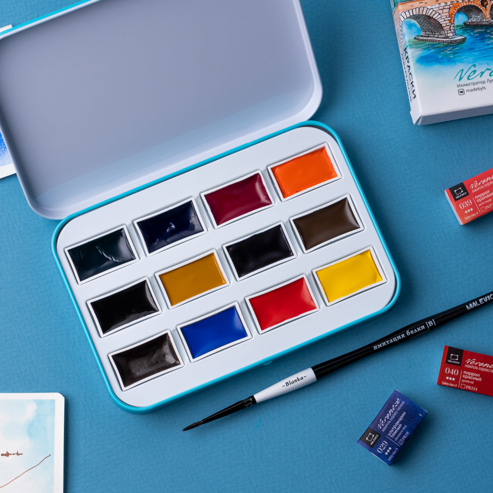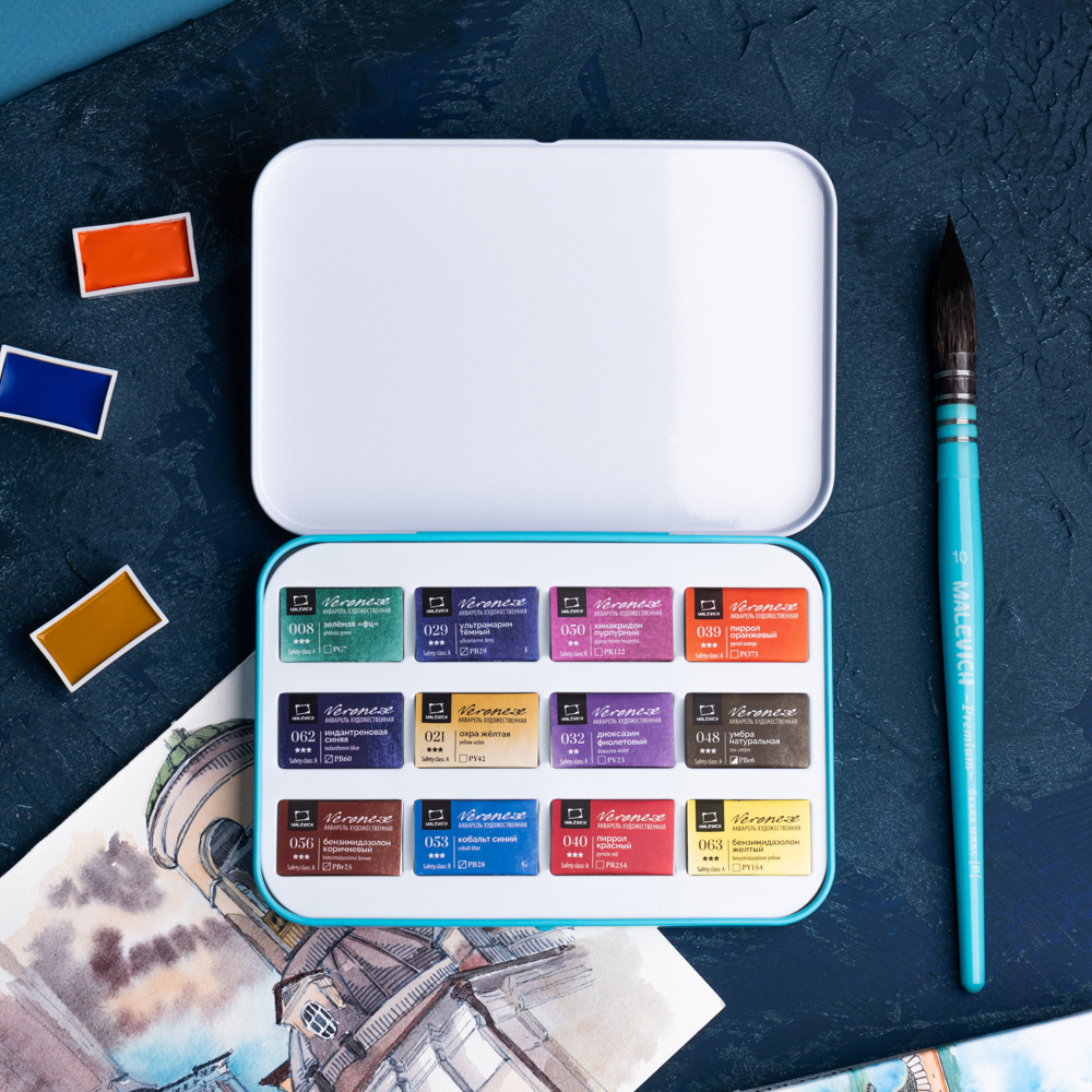 Серия акварели «Малевичъ» Veroneze создана совместно с российскими художницами из творческого онлайн журнала. Она содержит базовые цвета, а дополнительные оттенки подобраны таким образом, чтобы исключить некрасивые тусклые и глухие смеси. Все краски яркие, прозрачные и полупрозрачные, легко набираются, прекрасно смешиваются и дают ровные заливки. Есть и пара гранулирующих цветов, которые помогут создать волшебные фактуры и эффекты. Акварель создана без использования соединений кадмия и животных компонентов. В наборе 12 цветов.