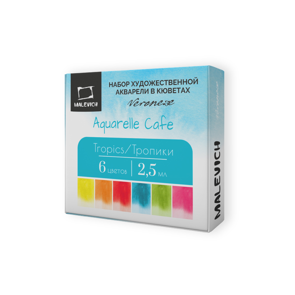 Серия акварели «Малевичъ» Veroneze из 25 цветов создана совместно с российскими художницами из творческого онлайн журнала. Она содержит базовые цвета, а дополнительные оттенки подобраны таким образом, чтобы исключить некрасивые тусклые и глухие смеси. Все краски яркие, прозрачные и полупрозрачные, легко набираются, прекрасно смешиваются и дают ровные заливки. Есть и пара гранулирующих цветов, которые помогут создать волшебные фактуры и эффекты. Акварель создана без использования соединений кадмия и животных компонентов. В наборе 6 цветов.