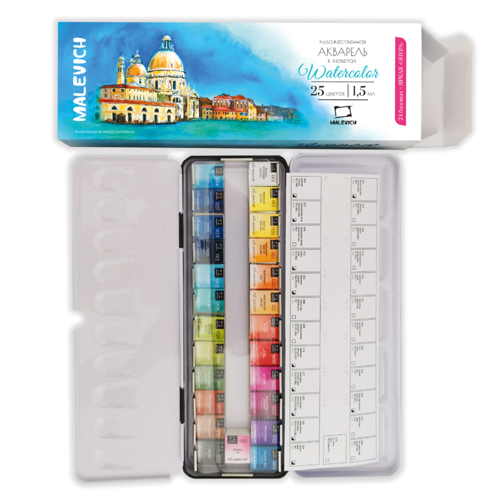 Серия акварели «Малевичъ» Veroneze из 25 цветов создана совместно с российскими художницами из творческого онлайн журнала. Она содержит базовые цвета, а дополнительные оттенки подобраны таким образом, чтобы исключить некрасивые тусклые и глухие смеси. Все краски яркие, прозрачные и полупрозрачные, легко набираются, прекрасно смешиваются и дают ровные заливки. Есть и пара гранулирующих цветов, которые помогут создать волшебные фактуры и эффекты. Акварель создана без использования соединений кадмия и животных компонентов. В наборе 25 цветов.