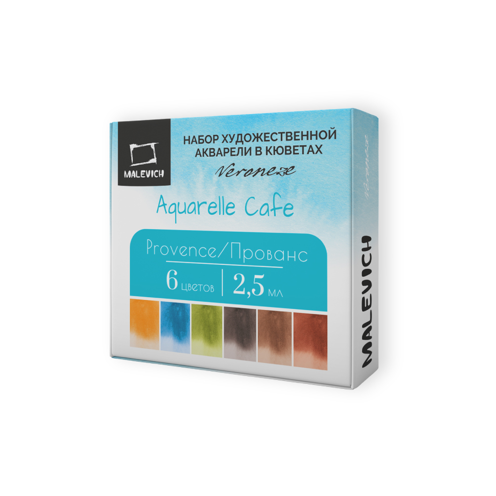 Серия акварели «Малевичъ» Veroneze из 25 цветов создана совместно с российскими художницами из творческого онлайн журнала. Она содержит базовые цвета, а дополнительные оттенки подобраны таким образом, чтобы исключить некрасивые тусклые и глухие смеси. Все краски яркие, прозрачные и полупрозрачные, легко набираются, прекрасно смешиваются и дают ровные заливки. Есть и пара гранулирующих цветов, которые помогут создать волшебные фактуры и эффекты. Акварель создана без использования соединений кадмия и животных компонентов. В наборе 6 цветов.