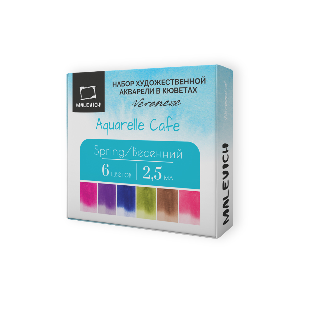 Серия акварели «Малевичъ» Veroneze из 25 цветов создана совместно с российскими художницами из творческого онлайн журнала. Она содержит базовые цвета, а дополнительные оттенки подобраны таким образом, чтобы исключить некрасивые тусклые и глухие смеси. Все краски яркие, прозрачные и полупрозрачные, легко набираются, прекрасно смешиваются и дают ровные заливки. Есть и пара гранулирующих цветов, которые помогут создать волшебные фактуры и эффекты. Акварель создана без использования соединений кадмия и животных компонентов. В наборе 6 цветов.