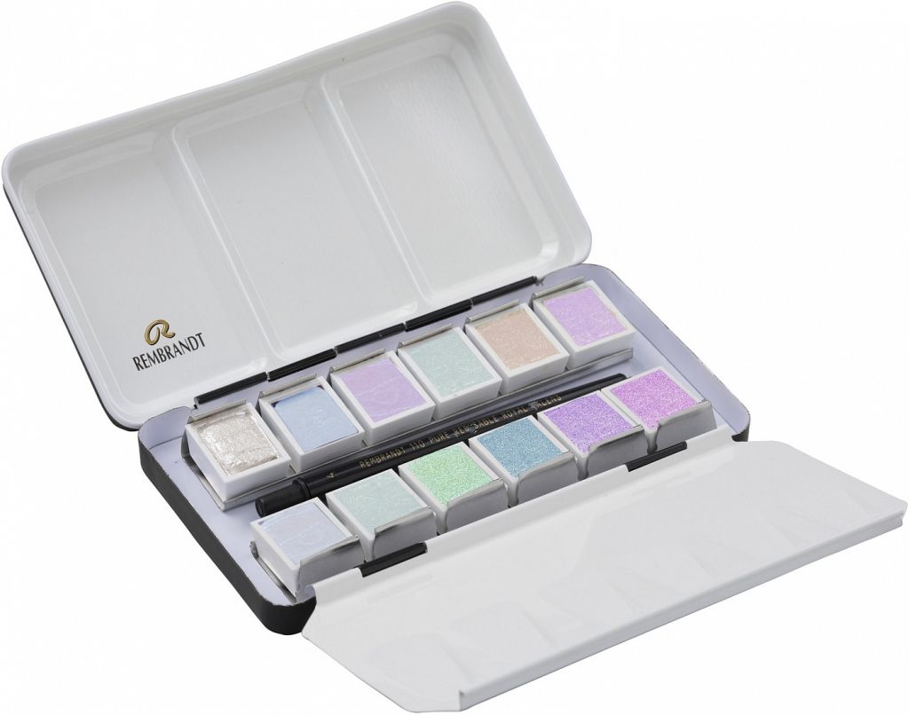 О серии: акварель Rembrandt представлена обновлённой широкой палитрой из 120 цветов, которые выпускаются в мягком виде в тубах, в полутвердом виде в кюветах. Краски предлагаются поштучно и в наборах различной комплектации. О наборе: набор с самыми инновационными пигментами для специальных эффектов. Цвета хамелеоны меняют оттенок, искрящиеся цвета сверкают неравномерным блеском, а интерферентные цвета дают жемчужное свечение. Лучше всего эти цвета проявляются на тёмном фоне. Комплектация набора: 12 цветов — №230, 234, 373, 410, 503, 507, 534, 539, 616, 629, 630, 682, сборная кисть серии 110 №4 (круглая из соболя), металлический пенал с палитрой. Характеристика: акварель Rembrandt – уникальная по своим свойствам профессиональная краска. В ней совмещены лучшие традиции прошлого и современные технологии. Эти краски изготавливаются из качественных пигментов сверхтонкого помола и чистого гуммиарабика. Благодаря мелкому помолу пигмента краска обладает высокой степенью светостойкости, прозрачности и при этом обеспечивает отличную цветопередачу. Она хорошо ложится на поверхность, позволяя художнику контролировать расход краски на бумаге с любой сложной фактурой. Производство: акварельные краски Rembrandt производится в городе Апелдорн голландской компанией ROYAL TALENS. Основал её Мартин Таленс (Marten Talens) в 1899 году. Титул «Royal» (Ройал, королевский) компания получила в 1949 году от королевской четы за высокое качество продукции и следование традициям. ROYAL TALENS производит все виды художественных красок и является одним из ведущих производителей в своей отрасли.