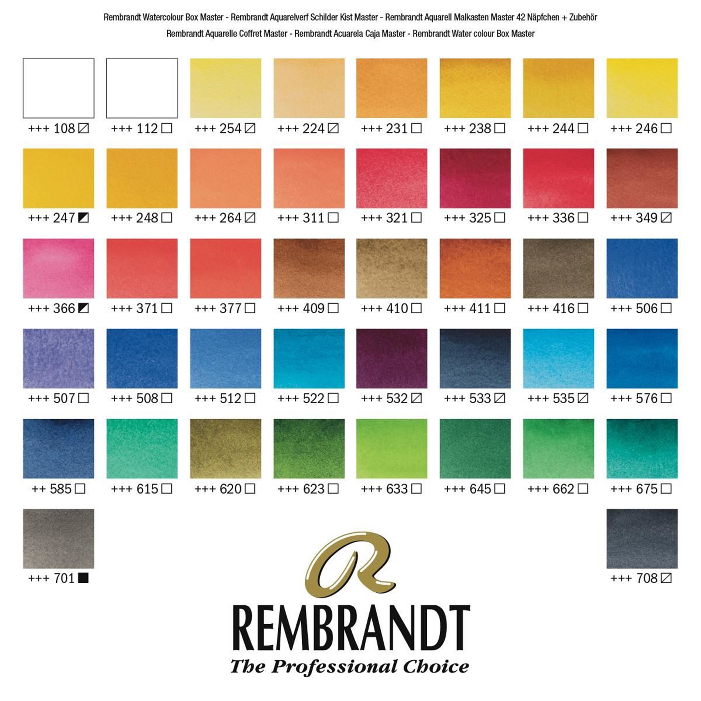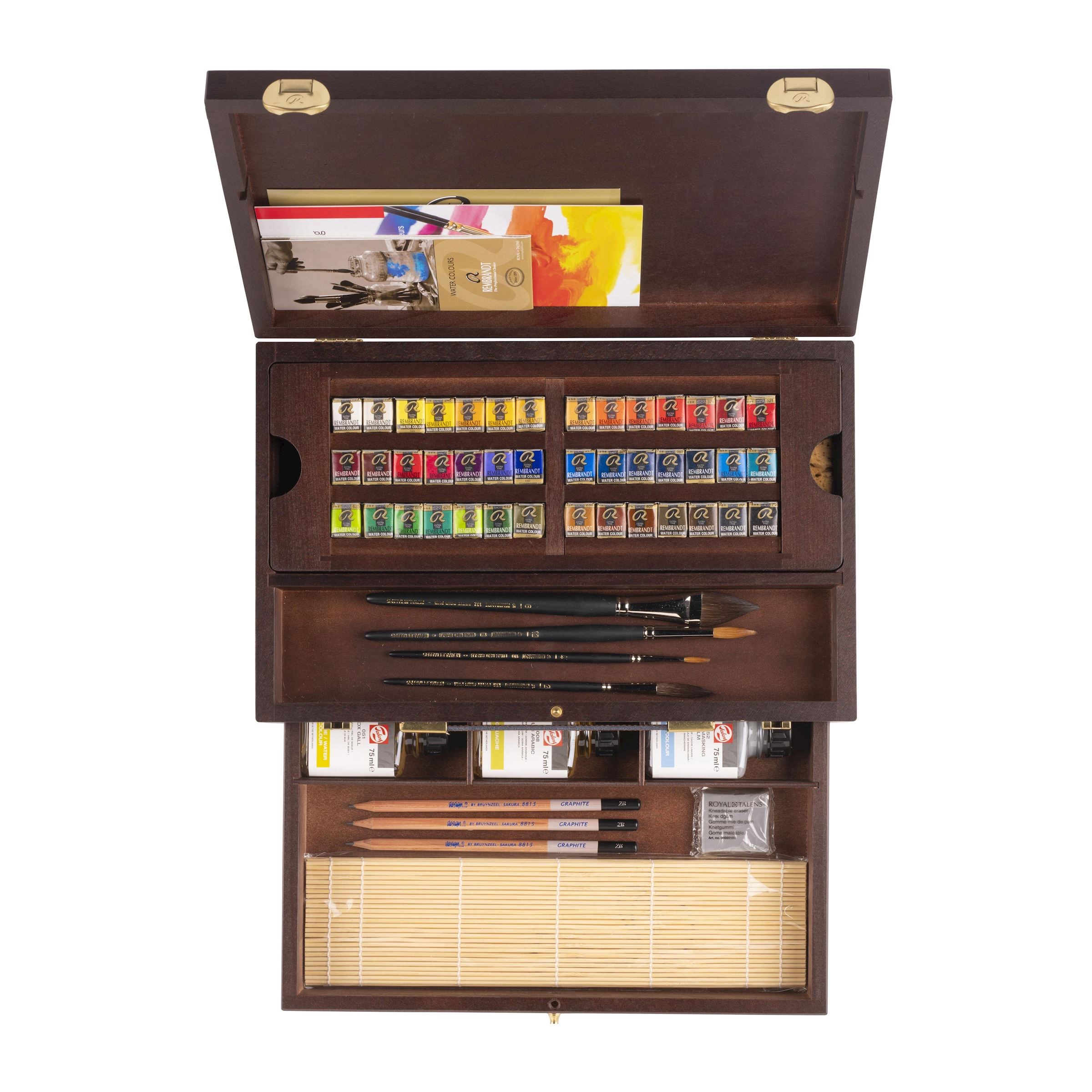 О серии: серия акварельных красок "Rembrandt" - это профессиональная акварель, обладающая всеми качествами, которые необходимы современным художникам. Каждый цвет состоит из высококачественных сконцентрированных пигментов и гуммиарабика без лишних примесей. Чистый и насыщенный цвет, в сочетании с текучестью и прозрачностью подарят вам неописуемые ощущения о работе с таким непокорным материалом, как акварель. Акварель "Rembrandt" обладает высочайшей светостойкостью и легко разбавляется водой, достигая максимального уровня прозрачности, который вам нужен, а благодаря монопигментному составу некоторых цветов вы можете смешивать краски в самых различных комбинациях, получая новые цвета без лишних примесей. Состав набора: 42 цвета акварели (выкраска в дополнительных фото), бычья желчь, гуммиарабик для гуаши и акварели, максирующая жидкость, карандаши чернографитные Bruynzeel-Sakura "Design", кисти, клячка и скрутка из бамбука. Производство: производится в городе Апелдорн голландской компанией «ROYAL TALENS», которую основал Мартин Таленс (Marten Talens) в 1899 году. «ROYAL TALENS» производит все виды художественных красок и является одним из ведущих производителей в своей отрасли.