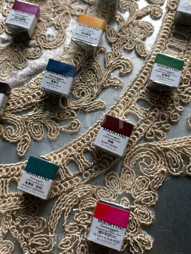 Mairtini Caravaggio — флагманская линейка акварельных красок бренда. Пигменты для этой акварели изготавливаются в Японии. Краски проходят 4–5 циклов розлива и естественной сушки, что делает их максимально насыщенными пигментов и концентрированными. Палитра включает 48 оттенков. Большая часть цветов выполнена на основе одного пигмента, что обеспечивает чистоту и глубину тона. Краски обладают высокой светостойкостью и не содержат наполнителей, благодаря чему работы сохраняют яркость и насыщенность в течение долгого времени. Caravaggio — профессиональная акварель высочайшего уровня, подходящая для сложных техник и многослойной живописи. Представлена в формате полукювет, премиальных наборов в деревянном ящике, а также гармонично подобранных наборов, из 6 кювет в деревянной упаковке с магнитом.