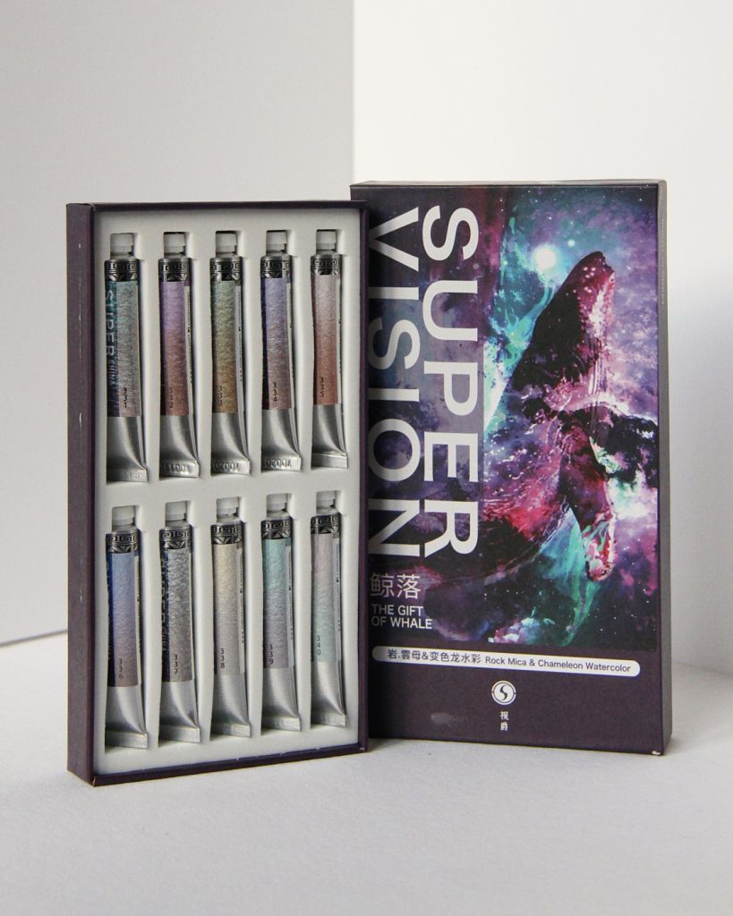 В наборе 10 цветов акварели Super Vision серии Rock. Все цвета акварели этой серии изготовлены с добавлением натуральной слюды, из высококачественных пигментов и минералов, устойчивых к высоким температурам и воздействию света (в большинстве случаев). Благодаря такому уникальному составу акварель обладает перламутровым блеском и эффектом «многослойности» — цвета могут меняться в зависимости от угла обзора и освещения. Несмотря на такие особенности серии, акварель традиционно можно смешивать между собой, добиваясь новых ярких решений в ваших работах. Также вы можете смешивать цвета данной серии с классической акварелью для создания различных эффектов. Для работы с акварелью данной серии рекомендуется использовать бумагу высокой плотности и большое количество воды — смело экспериментируйте в технике «по-сырому». Выкраски цветов в наборе вы можете увидеть в дополнительных фото.