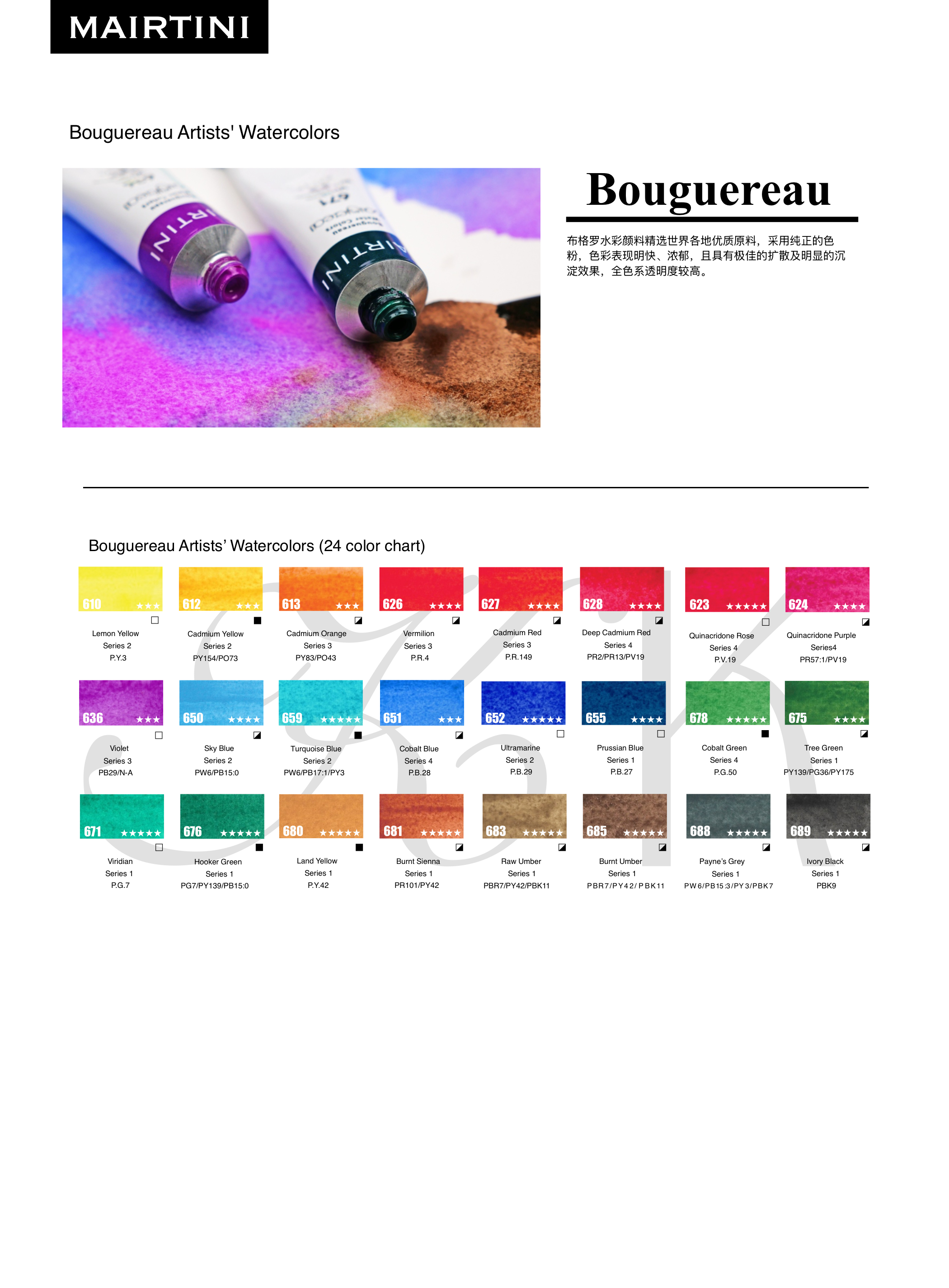 Акварельные краски Bouguereau изготавливаются из высококачественного сырья, собранного по всему миру. В производстве используется чистый пигмент, благодаря чему цвета получаются яркими и насыщенными, с отличной диффузией и выраженным эффектом оседания. Вся палитра отличается высокой прозрачностью. Краски обладают стабильностью и богатством оттенков, прекрасно растворяются в воде, мгновенно раскрываются при смачивании, обеспечивают интенсивное окрашивание и комфортное смешивание. Активная диффузия и эффект оседания делают их удобными для выражения широкого спектра художественных техник. Это акварель художественного уровня (Artist-Grade), которая подходит для создания профессиональных работ и гарантирует их долговечность.