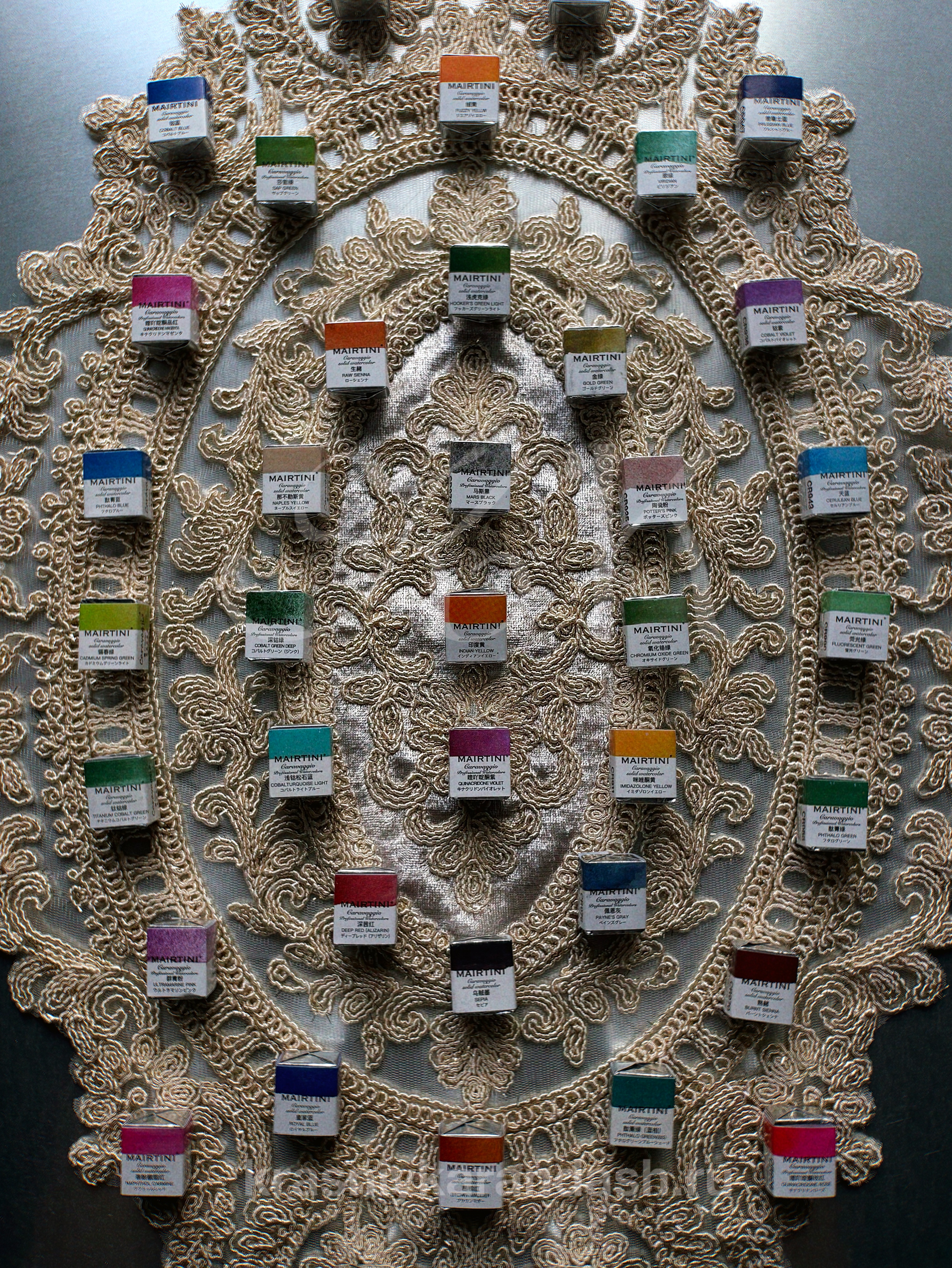 Mairtini Caravaggio — флагманская линейка акварельных красок бренда. Пигменты для этой акварели изготавливаются в Японии. Краски проходят 4–5 циклов розлива и естественной сушки, что делает их максимально насыщенными пигментов и концентрированными. Палитра включает 48 оттенков. Большая часть цветов выполнена на основе одного пигмента, что обеспечивает чистоту и глубину тона. Краски обладают высокой светостойкостью и не содержат наполнителей, благодаря чему работы сохраняют яркость и насыщенность в течение долгого времени. Caravaggio — профессиональная акварель высочайшего уровня, подходящая для сложных техник и многослойной живописи. Представлена в формате полукювет, премиальных наборов в деревянном ящике, а также гармонично подобранных наборов, из 6 кювет в деревянной упаковке с магнитом.