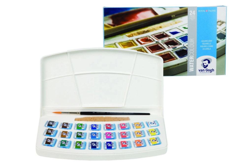 О серии: акварель Van Gogh представлена палитрой из 40 различных цветов. Все цвета выпускаются поштучно в тубах по 10 миллилитров и кюветах по 2,5 миллилитра. Также представлен широкий выбор наборов, которые удобно брать с собой. Комплектация набора: в данный набор входит 24 кюветы акварели Van Gogh и круглая кисть №6 с синтетическим ворсом. Набор упакован в коробку из белого пластика. Характеристика: в состав краски входят пигменты высокой степени очистки и чистый гуммиарабик. Акварель Van Gogh – это прозрачная краска с насыщенными и яркими цветами. Легко наносится на поверхность. Все цвета смешиваются между собой, образуя новые оттенки. Краска, даже сильно разведенная водой, обладает высокой светостойкостью. Уровень Study. Производство: акварельные краски Van Gogh производится в городе Апелдорн голландской компанией ROYAL TALENS. Основал её Мартин Таленс (Marten Talens) в 1899 году. Титул «Royal» (Ройал, королевский) компания получила в 1949 году от королевской четы за высокое качество продукции и следование традициям. ROYAL TALENS производит все виды художественных красок и является одним из ведущих производителей в своей отрасли.