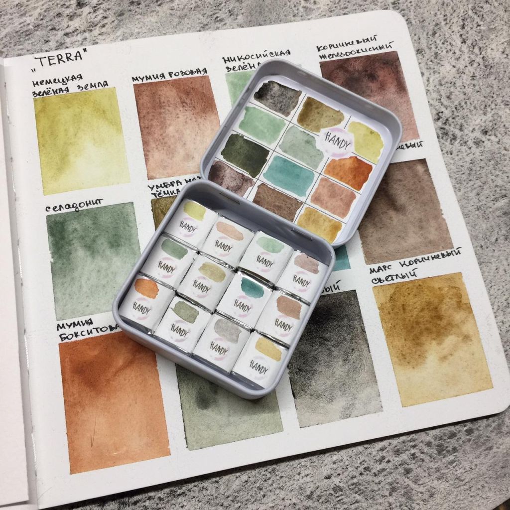Handy watercolor – это художественный эксперимент по поиску новых цветовых решений в акварельной реальности. Автор проекта делает основной упор в палитре на необычные оттенки, в том числе с грануляцией, для создания спецэффектов и неповторимых фактур в акварельных иллюстрациях. Это краски, сделанные вручную в Петербурге из натуральных и синтетических пигментов со всего мира. Они не содержат каких-либо наполнителей, только чистые пигменты. В качестве связующего используется чистый гуммиарабик, глицерин, мед, антисептик и бычья желчь. Отлично подойдут как начинающим художникам, так и профессионалам. Горнорастительные пеи?зажи Че?рного моря сделали свое? дело и вдохновили бренд Handy на создание набора TERRA. ?
