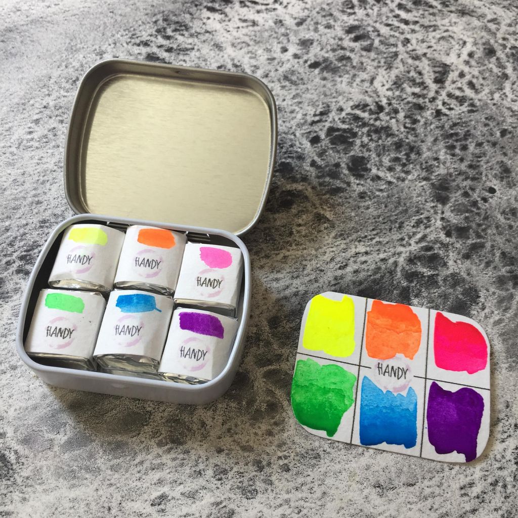 Handy watercolor – это художественный эксперимент по поиску новых цветовых решений в акварельной реальности. Автор проекта делает основной упор в палитре на необычные оттенки, в том числе с грануляцией, для создания спецэффектов и неповторимых фактур в акварельных иллюстрациях. Это краски, сделанные вручную в Петербурге из натуральных и синтетических пигментов со всего мира. Они не содержат каких-либо наполнителей, только чистые пигменты. В качестве связующего используется чистый гуммиарабик, глицерин, мед, антисептик и бычья желчь. Отлично подойдут как начинающим художникам, так и профессионалам. Яркий, сочный, летний — набор неоновый. Этими цветами можно рисовать по белой и чёрной бумаге, да и вообще по любой. Отлично подойдёт для усиления яркости и насыщенности стандартных цветов в вашей палитре, а также акцентирует внимание на мелких деталях.