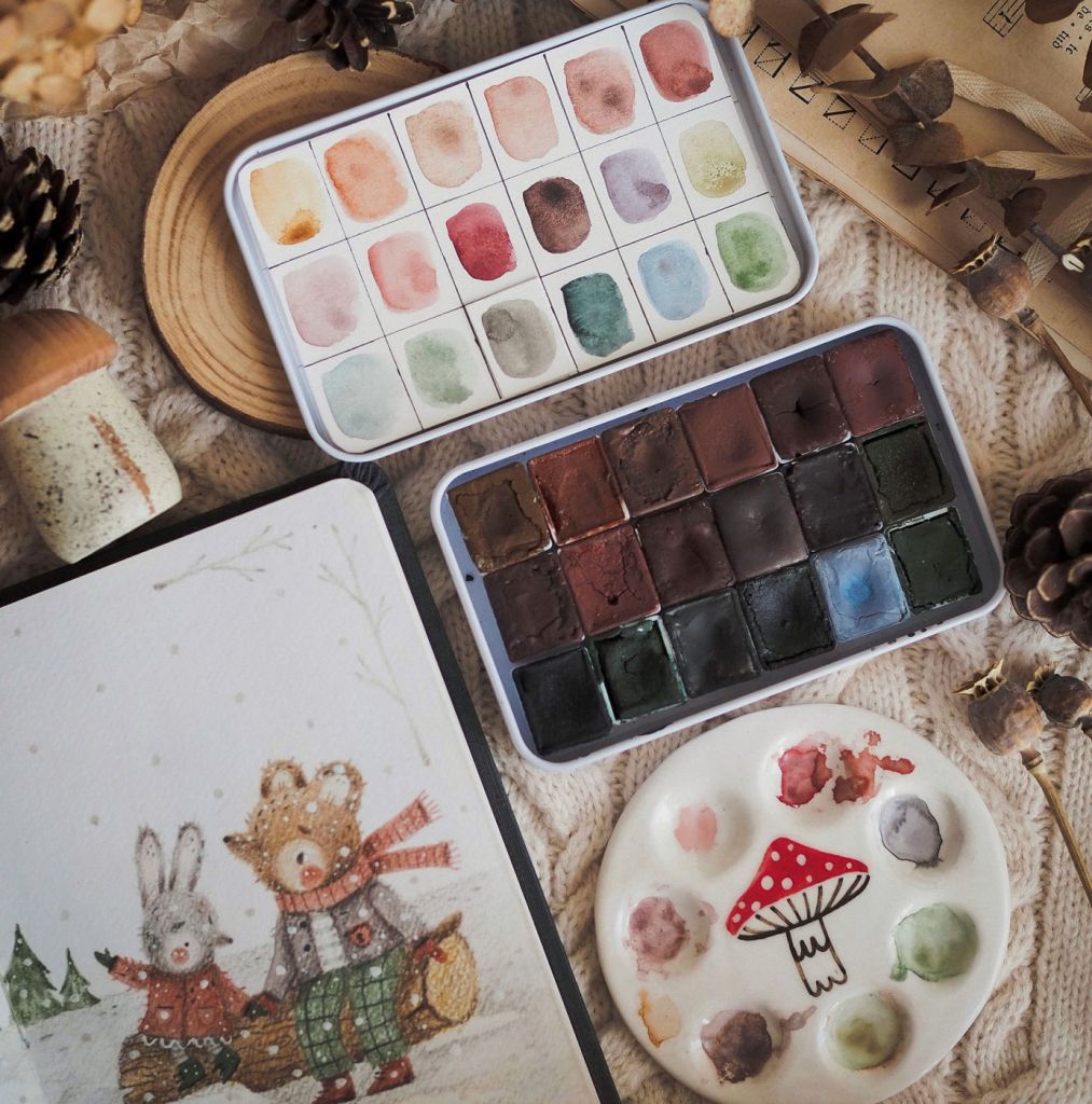 Handy watercolor – это художественный эксперимент по поиску новых цветовых решений в акварельной реальности. Это краски, сделанные вручную в Петербурге из натуральных и синтетических пигментов со всего мира. Они не содержат каких-либо наполнителей, только чистые пигменты. В качестве связующего используется чистый гуммиарабик, глицерин, мед, антисептик и бычья желчь. Отлично подойдут как начинающим художникам, так и профессионалам. Набор содержит теплые цвета для создания невероятных волшебных жителей леса.