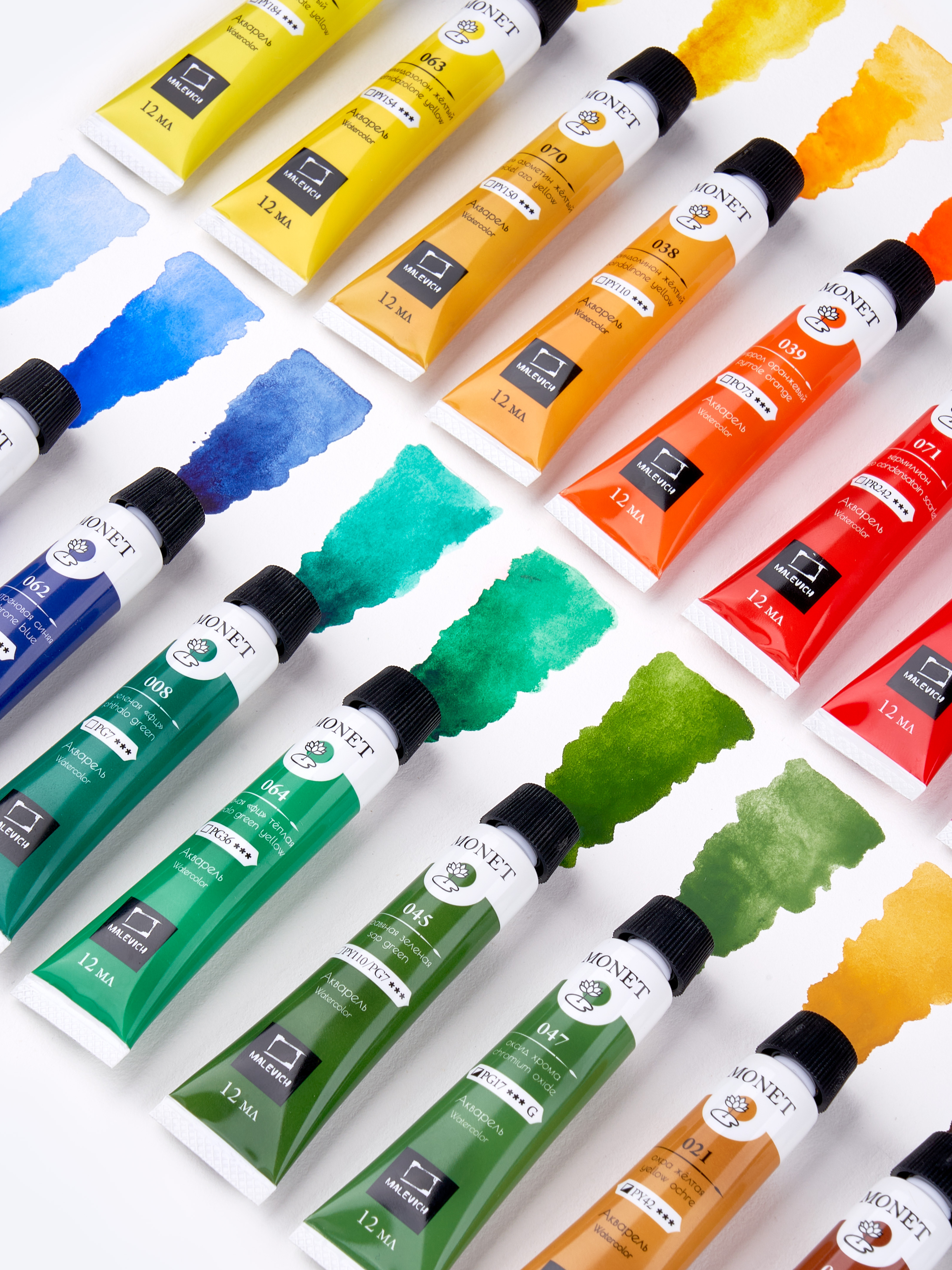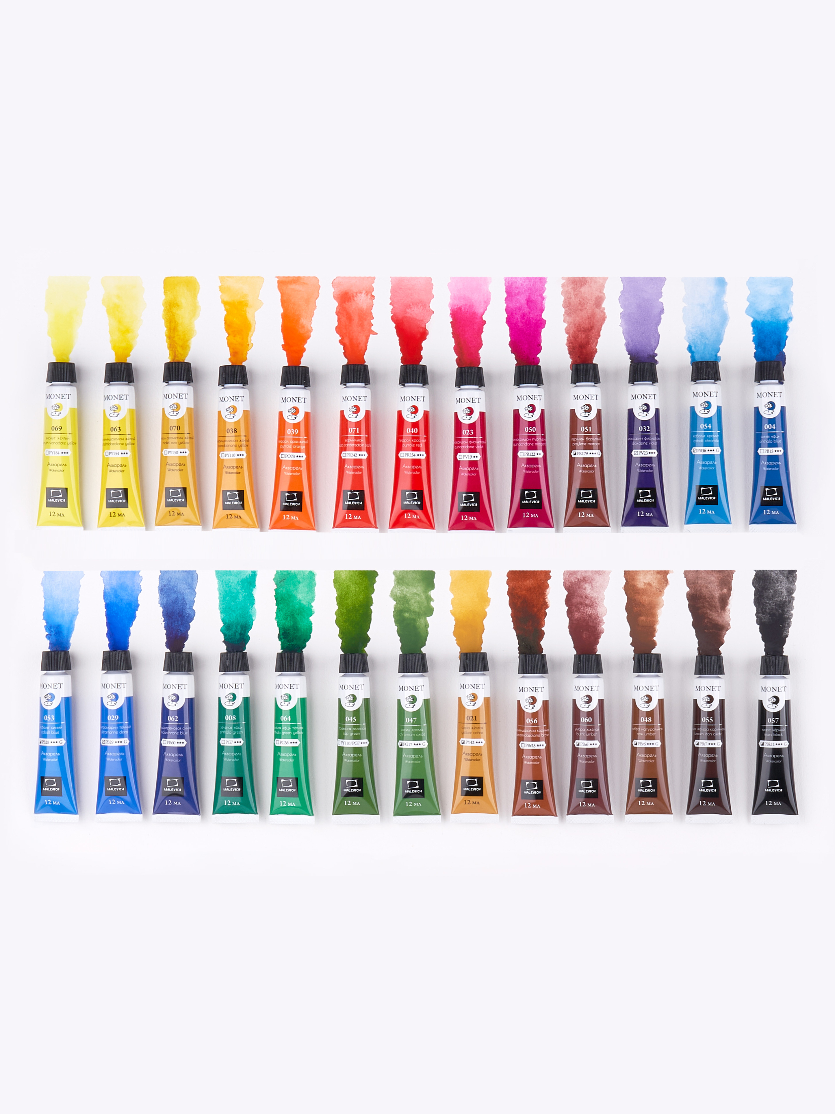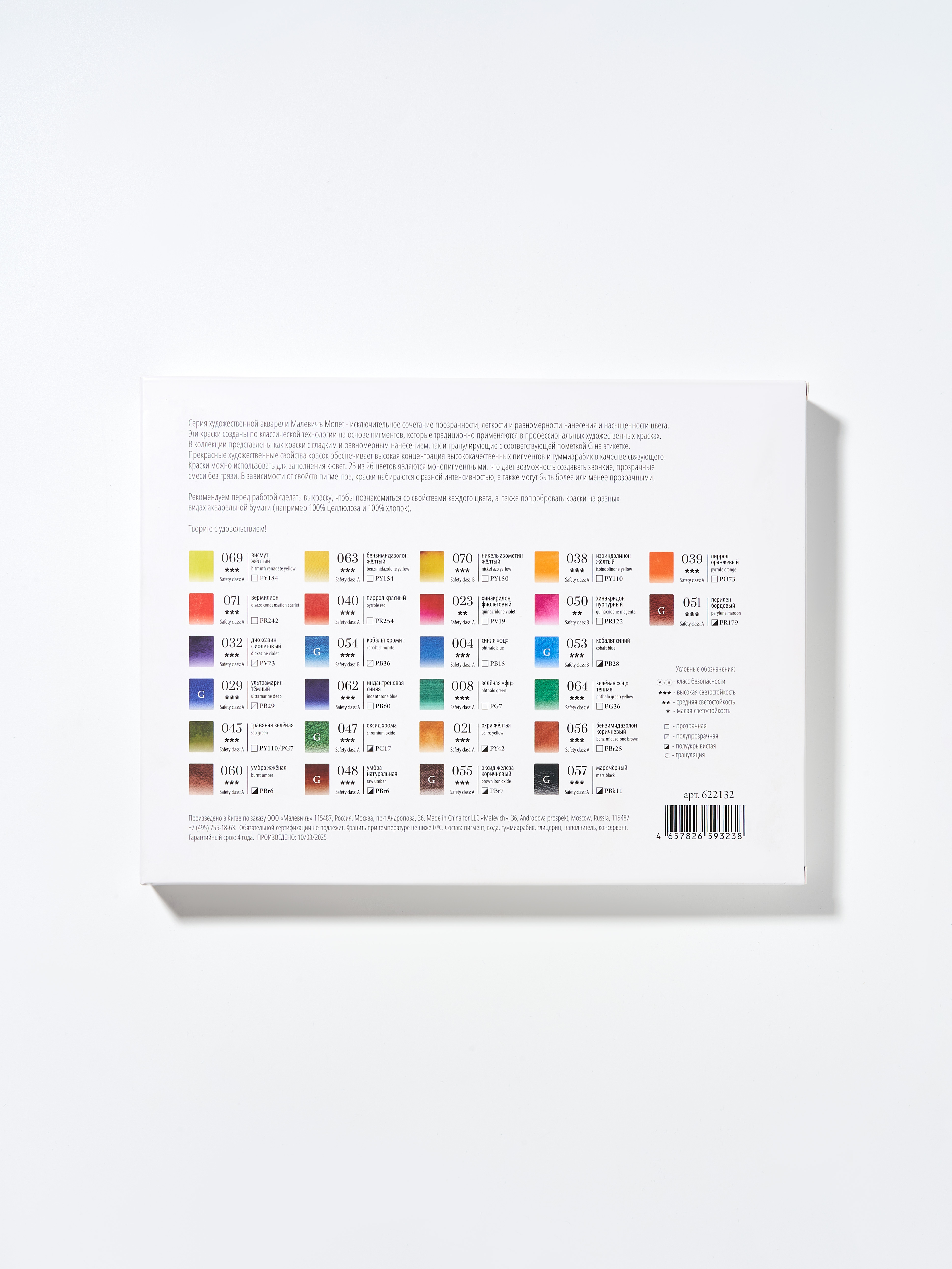 Серия акварели Monet является принципиально новым продуктом бренда: краски сделаны на основе современных светостойких пигментов. Сейчас в серии 26 цветов и 25 из них - однопигментные, что гарантирует звонкие и чистые смеси для иллюстраций. В линейке представлены как классические акварельные цвета, так и гранулирующиеся с соответствующей пометкой G на этикетке. При высыхании акварель остается такой же яркой и насыщенной. Эти краски созданы по классической технологии на основе лучших пигментов, которые традиционно применяются в профессиональных художественных красках. В состав красок входит: пигмент (концентрированный экстрамелкого помола), гуммиарабик высокого качества, наполнитель, глицерин, вода, консервант. Краски обладают кремовой консистенцией и подходят для наполнения кювет, но при использовании из тубы краски будут ярче и насыщеннее. Подходит для работ в различных техниках: заливка, лессировка, по-мокрому и "сухая кисть".