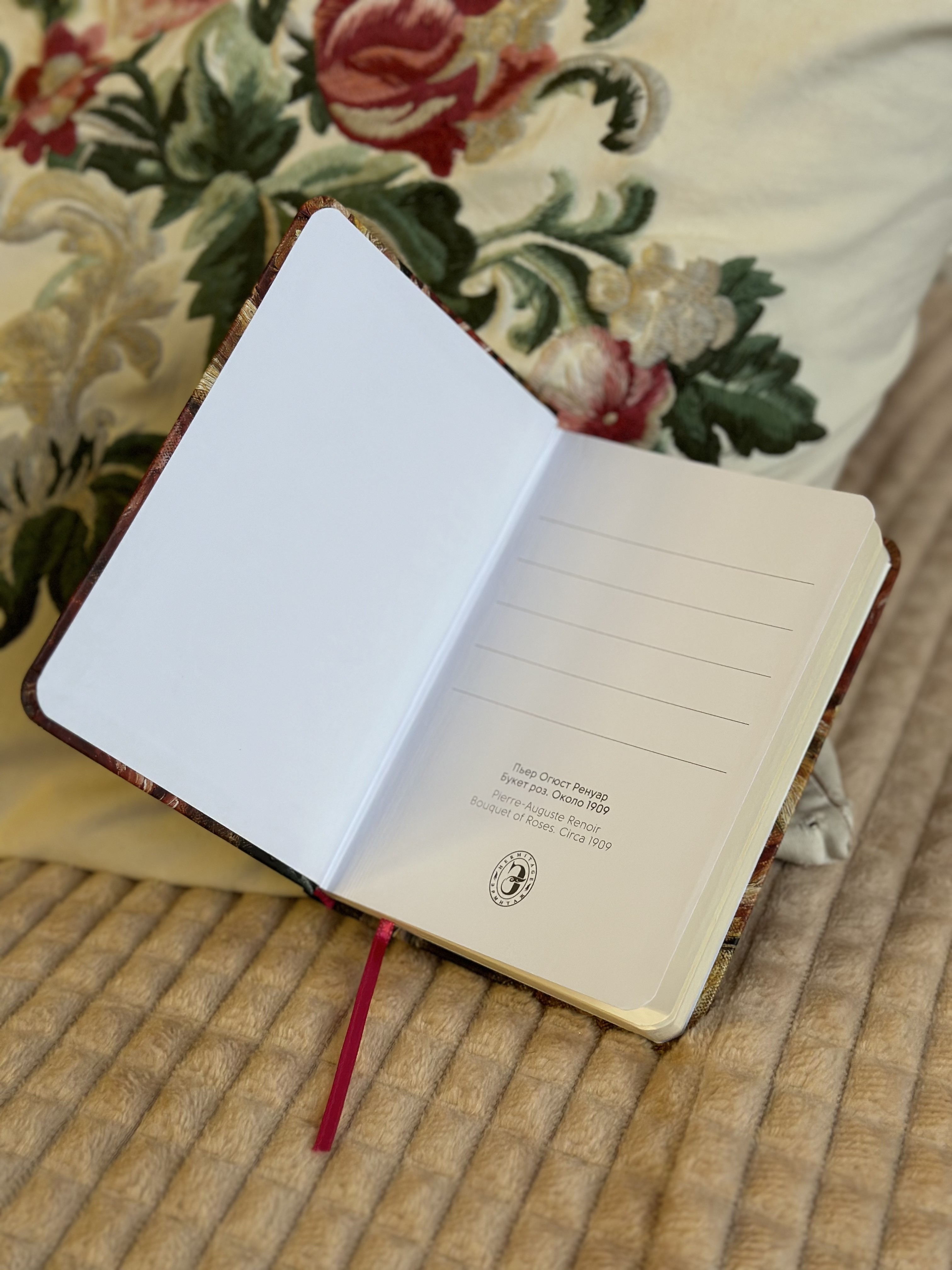 Блокнот из коллекции, посвящённой наследию Огюста Ренуара. Практичный твёрдый переплёт из прессованного картона и резинка-фиксатор позволяют не беспокоиться о сохранности заметок. Обложка блокнота украшена фрагментом работы Ренуара из собрания Эрмитажа.