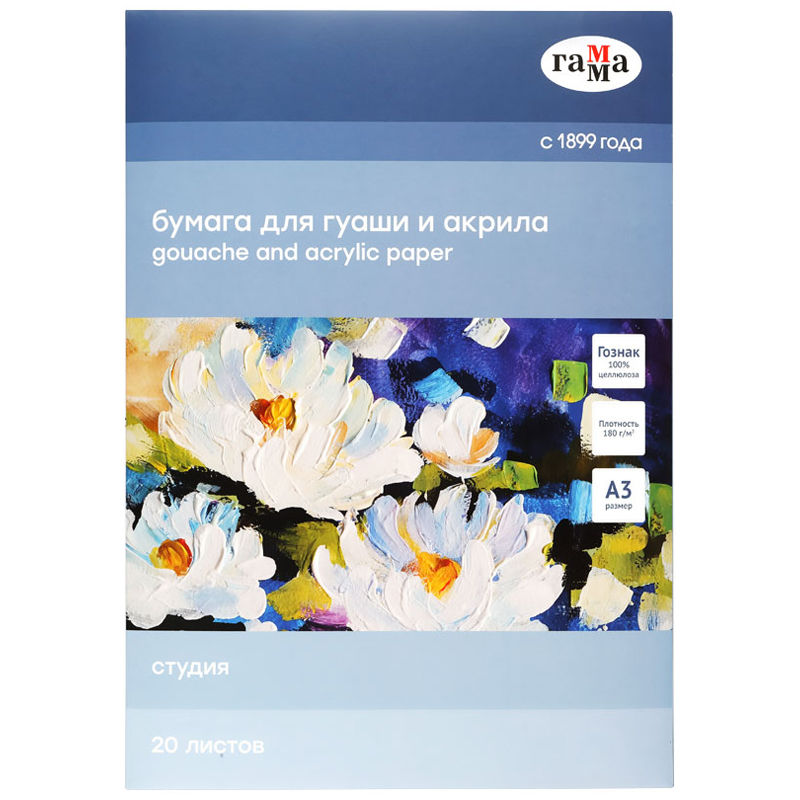 Папка «Гамма Студия» предназначена для работ гуашевыми красками, акриловыми, а также темперой. Бумага изготовлена на «Гознаке» из 100% целлюлозы, плотностью 180 г/м2. Гладкая по обеим сторонам. Обладает высокой степенью адгезии и не требует дополнительной подготовки. Папка состоит из 20 листов, представлена в форматах А3 и А4.