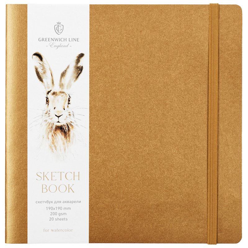 Скетчбук для акварели Greenwich Line состоит из 20 листов акварельной бумаги плотностью 200 г/м2, тип скрепления – сшивка. Удобный размер 190*190 мм позволяет взять скетчбук с собой и делать зарисовки на улице и в путешествии. Квадратный формат является оптимальным для творчества, так как симметричные композиции на нем смотрятся гораздо интереснее и гармоничнее. Мягкая обложка из дизайнерского картона золотого цвета фиксируется резинкой в тон. Скетчбук Greenwich Line – ваша уютная мастерская, на страницах которой вы можете размышлять в виде набросков или заметок.