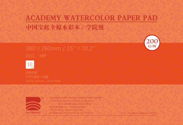 О серии: альбом склейка по 4-м сторонам. Внутри альбома блок из 10 листов мелкозернистой бумаги, выполненной из 100% хлопка. Бумага произведена без кислот и отбеливателей, обладает естественным белым цветом и плотностью 200 гр/м. Альбомы представлены в 3 различных форматах. Запатентованные методы обработки бумаги Baohong обеспечивают высокую насыщенность цвета даже после высыхания красок. Применение: для художественных работ акварелью и другими красками на водной основе. О бренде: изготавливается под брендом Baohong на фабрике по производству специализированной и художественной бумаги в Китае. Фабрика была основана в 1992 году и в настоящее время имеет множество запатентованных разработок бумаги различного типа — от эскизной до цифровой художественной бумаги для печати. Профессиональное качество, строгие технологии и широкая адаптивность обеспечивают высокие стандарты специализированной бумаги бренда Baohong для самых различных работ.