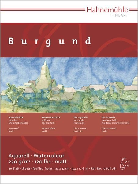 Бумага для акварели «Burgund» («Бургунд») производится компанией «Hahnem?hle FineArt GmbH» («Ханемюле файнарт»). История предприятия берёт начало в 1584 году в Германии. Технологии, отработанные на протяжении веков, и постоянный контроль над качеством продукции, помогли предприятию занять ведущие позиции в арт-индустрии. Сегодня «Hahnem?hle FineArt GmbH» производит бумажную продукцию для широкого круга потребителей. Бумага для акварели «Burgund» изготавливается из целлюлозы без добавления кислот. Особенность этой бумаги в том, что ещё не высохшую краску можно с лёгкостью смыть до белого листа. Бумага «Burgund» подойдёт для всех акварельных техник, в том числе для живописи «по мокрому». Также её можно применять в работе с гуашью или темперой. Бумага для акварели «Burgund» обладает естественным белым цветом. Её плотность 250 г/кв.м. Бумага выпускается поштучно в листах и в склейках разного формата.