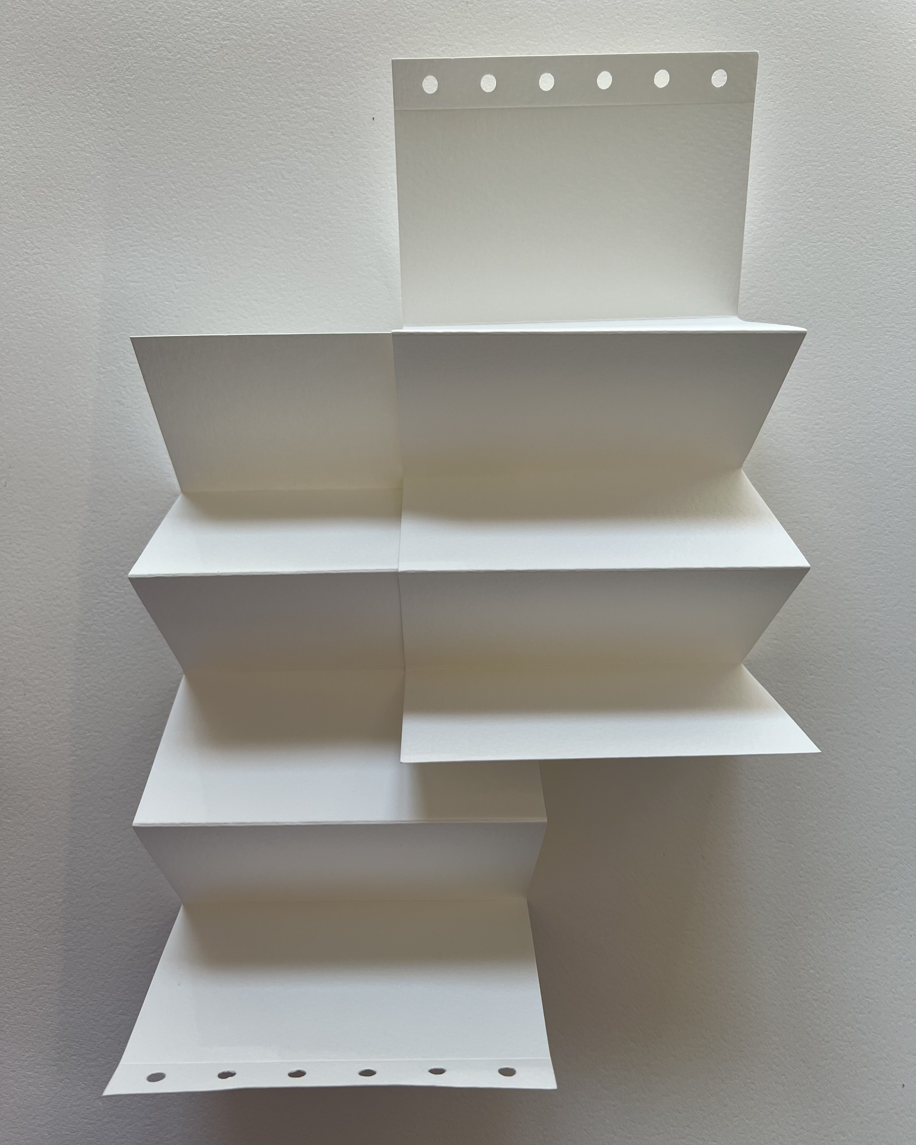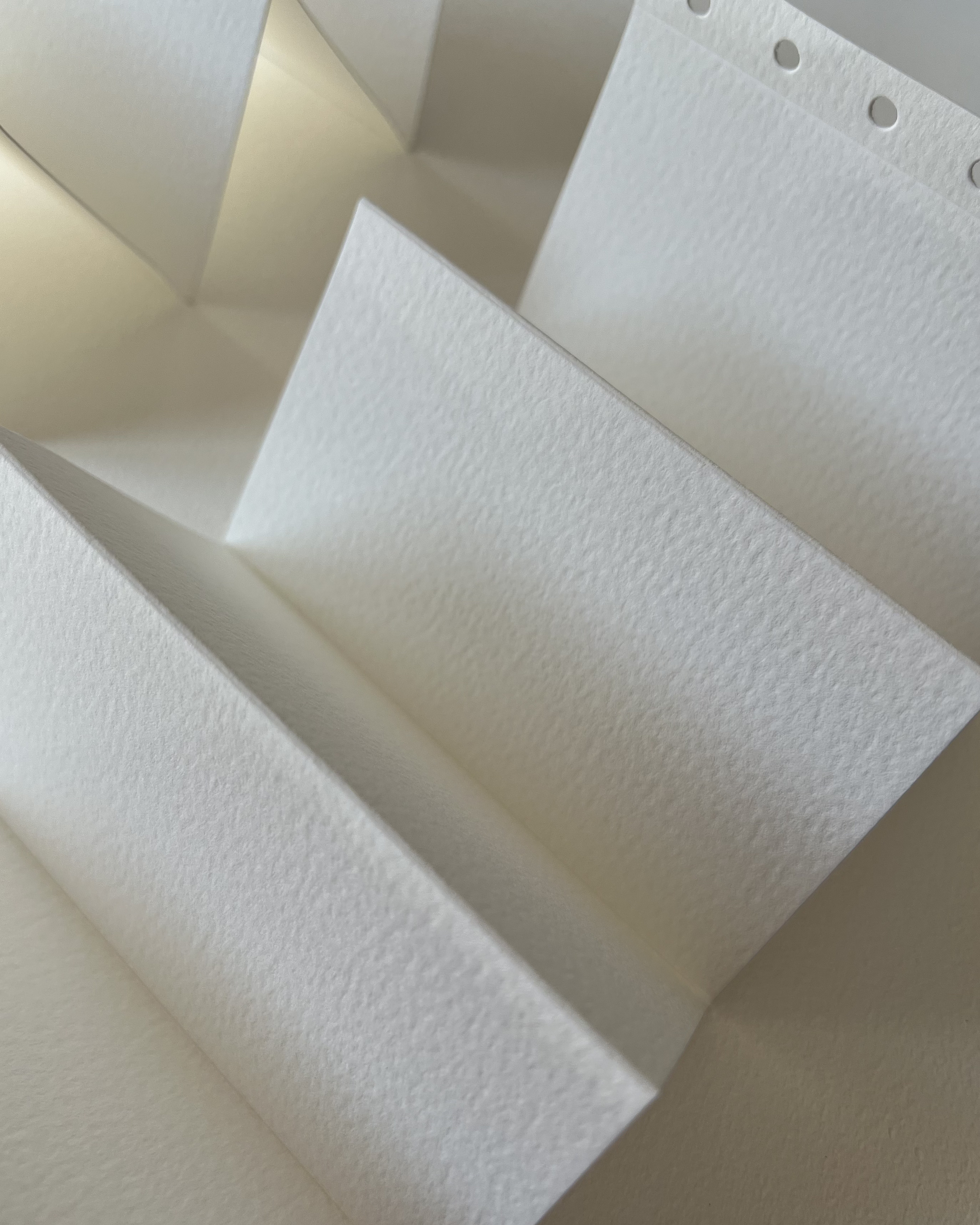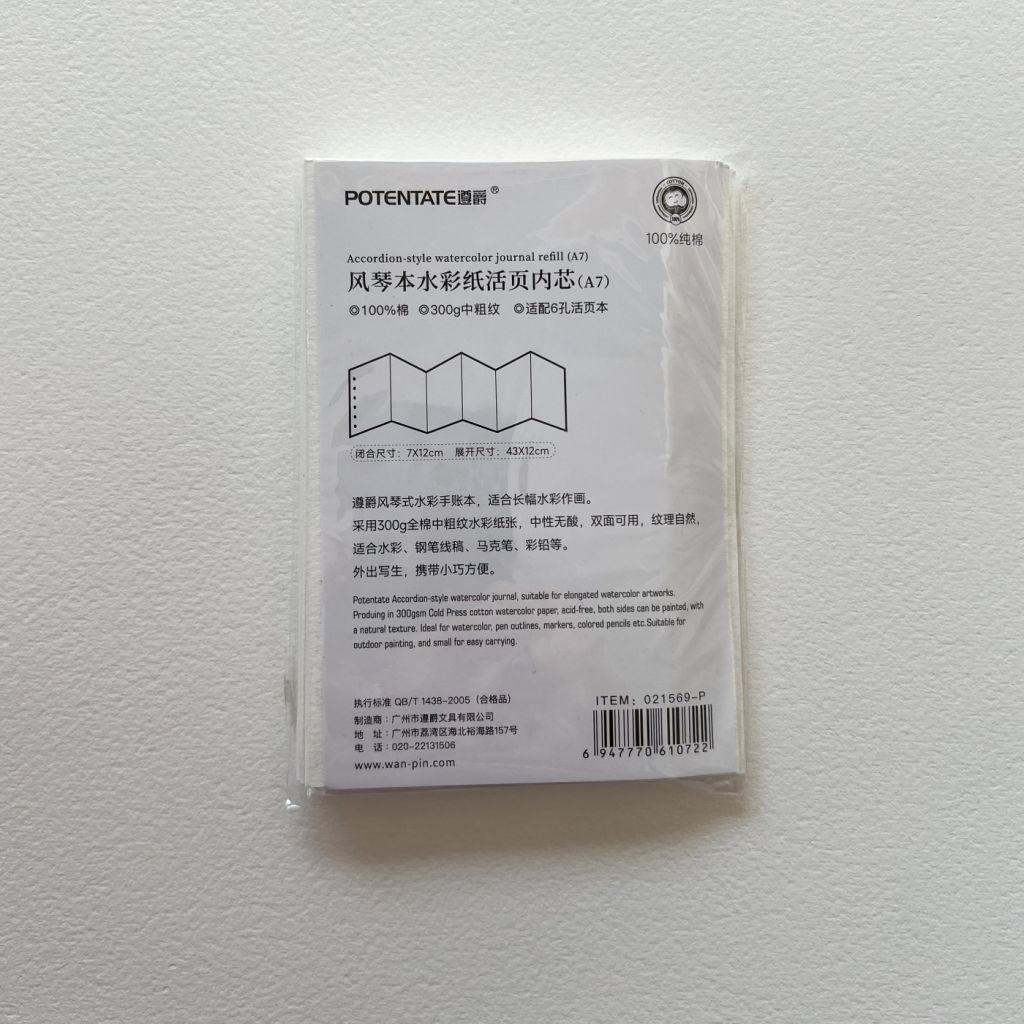 В наборе 2 листа хлопковой бумаги плотностью 300 гр/м2, по краю листа предусмотрены отверстия для крепления листов качестве сменных блоков на кольцах. Листы сложены по типу скетчбуков zig-zag, в сложенном виде его размер составляет 8,5x12 см., в разложенном представляет собой панорамный лист размером 43х12 см. Среднезернистая фактура бумаги и высокая плотность позволяет создавать панорамные акварельные работы с использованием большого количества воды.