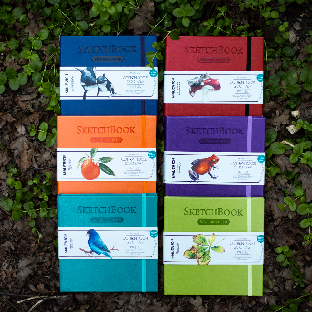 Компактные скетчбуки для акварели в книжном переплёте формата 14,5х14,5 см. Внутри скетчбука блок из 30 листов мелкозернистой бумаги выполненной из 100% хлопка без применения кислот и отбеливателей. Плотность бумаги 200 гр/м2 позволяет писать акварелью и другими красками на водной основе с использованием достаточно большого количества воды. Серия представлена скетчбуками в обложках разного цвета.