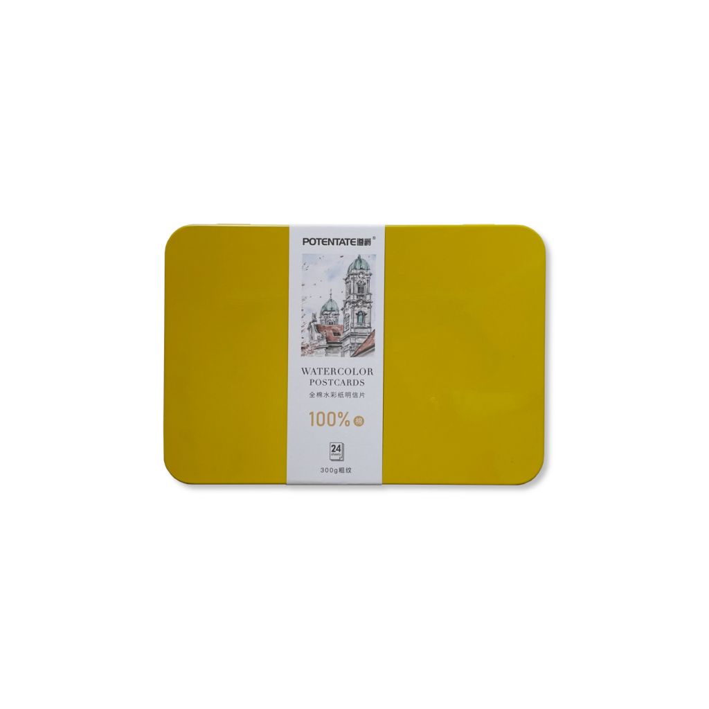 Наборы акварельных открыток от Potentate содержат по 24 листа бумаги выполненной из 100% хлопка без кислот отбеливателей. Плотность бумаги 300 гр/м2 позволяет создавать акварельные миниатюры с использованием большого количества воды. Фактура бумаги среднезернистая, на обратной стороне предусмотрена разметка для подписи. Размер открыток 10,5х15,5 см. Упакованы в металлические коробочки разных цветов.