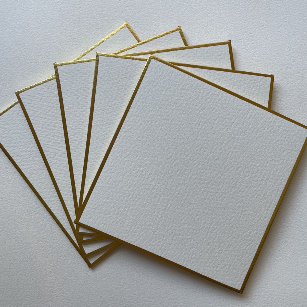 В наборе 5 листов бумаги, выполненной из 100% хлопка на плотной картонной подложке. Листы оформлены тонкой рамкой золотого цвета. Высокая плотность бумаги 300 гр/м2 и картонная подложка позволяют создавать уникальные акварельные миниатюры с использованием большого количества воды, бумага устойчива к смывкам и исправлениям. Серия представлена наборами бумаги разных форматов.