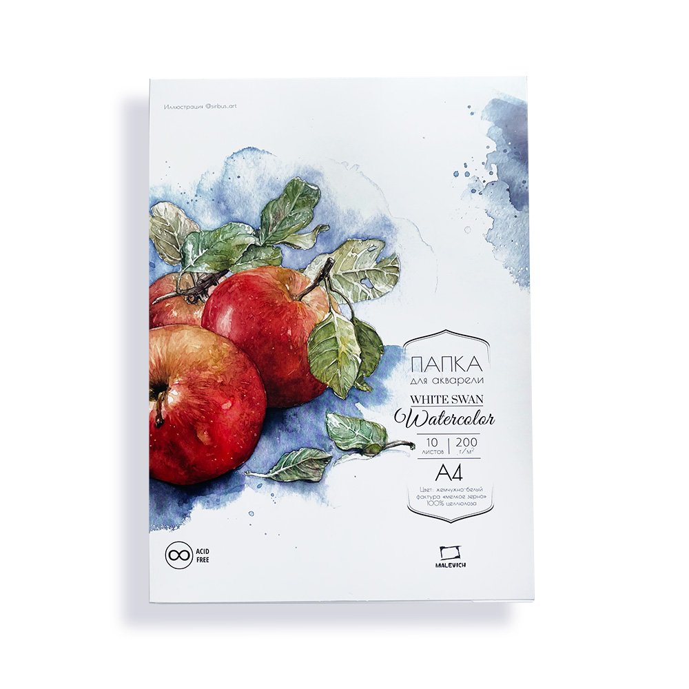 White Swan это бренд акварельной бумаги из Германии. Завод существует уже более 100 лет и специализируется на производстве качественной художественной бумаги в среднем ценовом сегменте. В папке используются акварельная бумага с мелким зерном Fin плотностью 200 г/м, 100% целлюлоза. Бумага позволяет делать очень яркие работы, цвета отлично смешиваются и остаются сочными, не замыливаются и не жухнут. Бумага дополнительно отбелена, что также усиливает яркость красок. Благодаря специальной пропитке влага на поверхности высыхает медленно, что дает возможность заливке равномерно растечься, а также вовремя внести коррективы.