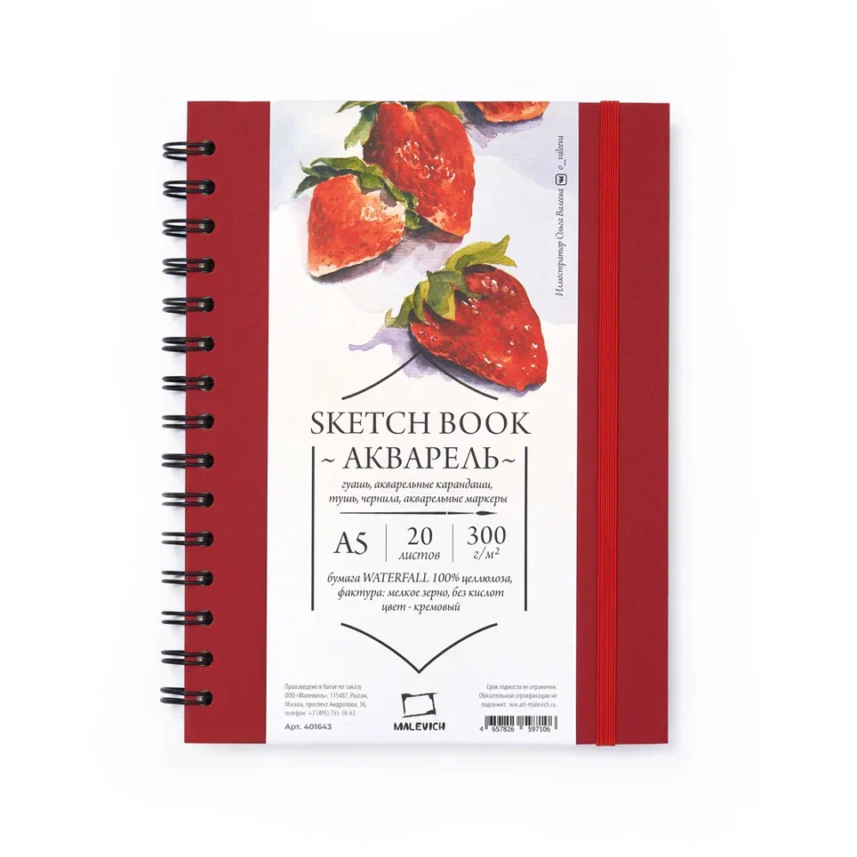 Скетчбук для акварели на спирали Малевичъ "WaterFall" 15х20 см - качественный и универсальный продукт для работы с акварелью. С плотной задней обложкой и резинкой для закрывания. Внутри 20 листов бумаги Waterfall для акварели с мелким зерном из 100% альфа целлюлозы, плотностью 300 г/м2. Из бумаги удален лигнин (woodpulp paper), поэтому бумага не стареет, не желтеет и сохраняет рисунок на долгие годы. Обеспечивает равномерную акварельную заливку, впитывает воду, слабо деформируется, стойкая к вымыванию. Не съедает пигмент, оставляя яркие цвета неизменными. Без кислот.