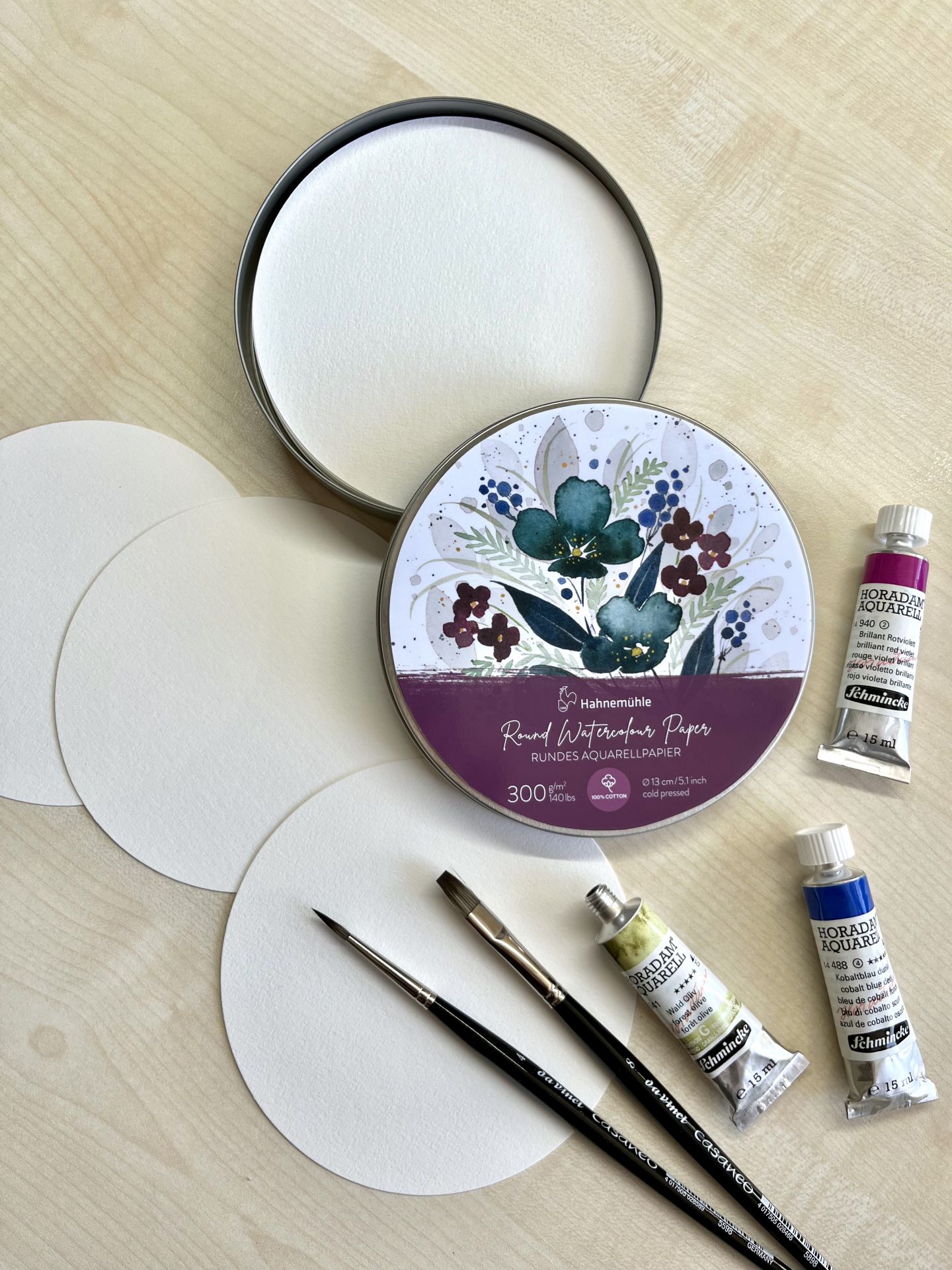 Набор предназначен для создания акварельных открыток и миниатюр. В наборе 30 листов из 100% хлопка плотностью 300 гр/м2. Диаметр 13 см. Бумага хорошо впитывает влагу и выдерживает несколько слоев акварели. Может также использоваться для гуаши, акрила, линеров и маркеров на водной основе. Набор упакован в презентабельный металлический футляр.