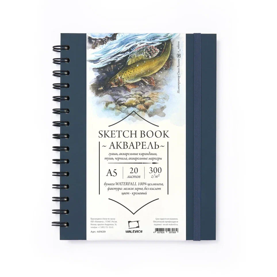 Скетчбук для акварели на спирали Малевичъ "WaterFall" 15х20 см - качественный и универсальный продукт для работы с акварелью. С плотной задней обложкой и резинкой для закрывания. Внутри 20 листов бумаги Waterfall для акварели с мелким зерном из 100% альфа целлюлозы, плотностью 300 г/м2. Из бумаги удален лигнин (woodpulp paper), поэтому бумага не стареет, не желтеет и сохраняет рисунок на долгие годы. Обеспечивает равномерную акварельную заливку, впитывает воду, слабо деформируется, стойкая к вымыванию. Не съедает пигмент, оставляя яркие цвета неизменными. Без кислот.