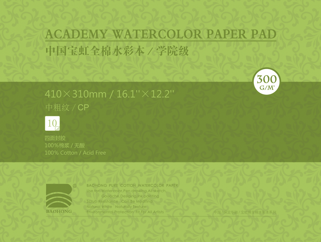 О серии: альбом склейка по 4-м сторонам. Внутри альбома блок из 10 листов среднезернистой бумаги, выполненной из 100% хлопка. Бумага произведена без кислот и отбеливателей, обладает естественным белым цветом и высокой плотностью 300 гр/м, что позволяет работать акварелью с использованием большого количества воды. Альбомы представлены в 6 различных форматах. Применение: для художественных работ акварелью и другими красками на водной основе. О бренде: изготавливается под брендом Baohong на фабрике по производству специализированной и художественной бумаги в Китае. Фабрика была основана в 1992 году и в настоящее время имеет множество запатентованных разработок бумаги различного типа — от эскизной до цифровой художественной бумаги для печати. Профессиональное качество, строгие технологии и широкая адаптивность обеспечивают высокие стандарты специализированной бумаги бренда Baohong для самых различных работ.