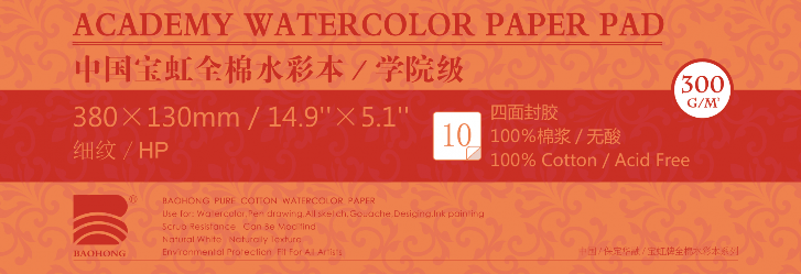 О серии: альбом склейка по 4-м сторонам. Внутри альбома блок из 10 листов мелкозернистой бумаги, выполненной из 100% хлопка. Бумага произведена без кислот и отбеливателей, обладает естественным белым цветом и высокой плотностью 300 гр/м, что позволяет работать акварелью с использованием большого количества воды. Альбомы представлены в 6 различных форматах. Применение: для художественных работ акварелью и другими красками на водной основе. О бренде: изготавливается под брендом Baohong на фабрике по производству специализированной и художественной бумаги в Китае. Фабрика была основана в 1992 году и в настоящее время имеет множество запатентованных разработок бумаги различного типа — от эскизной до цифровой художественной бумаги для печати. Профессиональное качество, строгие технологии и широкая адаптивность обеспечивают высокие стандарты специализированной бумаги бренда Baohong для самых различных работ.