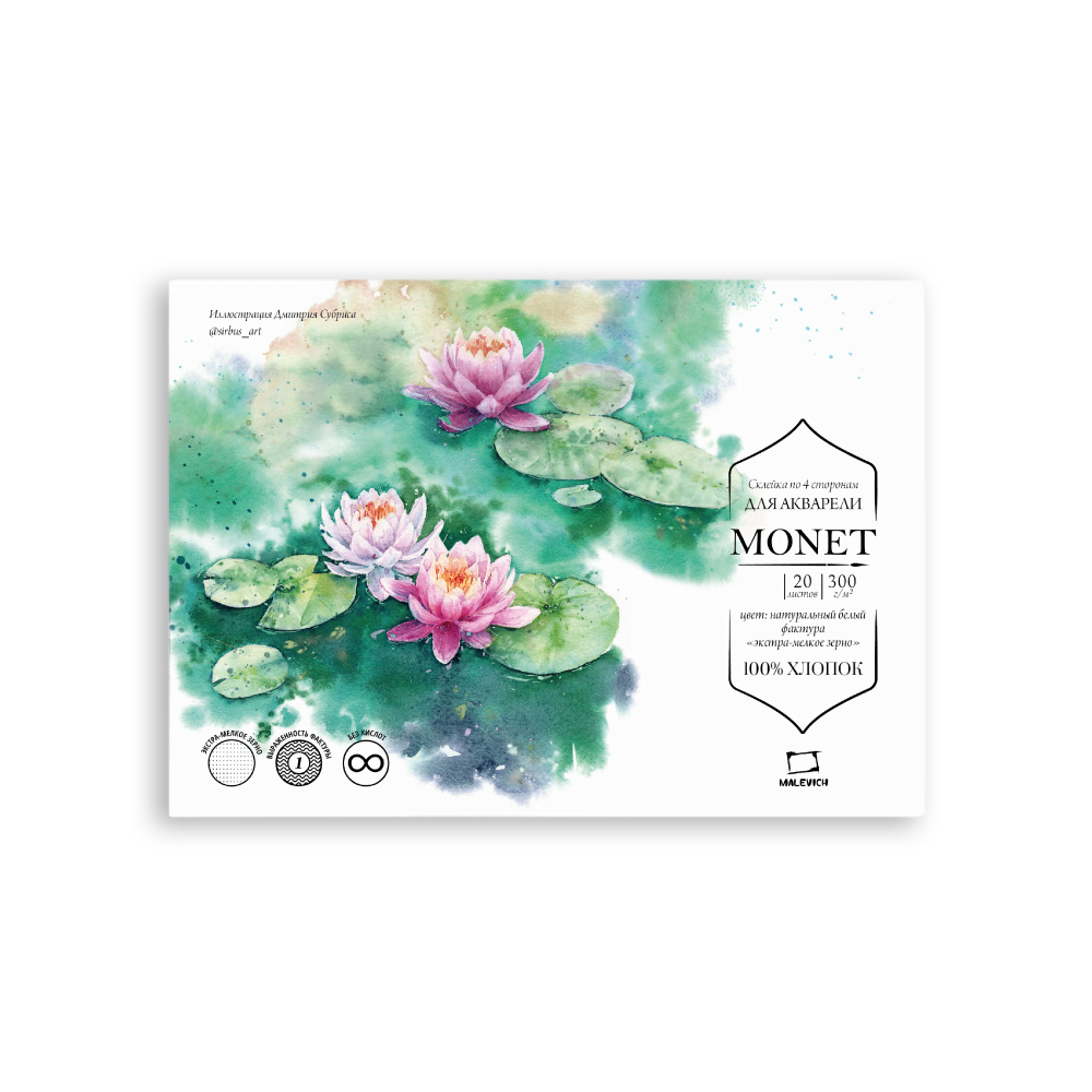 Бумага для акварели из 100% хлопка Monet — это классическая хлопковая бумага с присущими для хлопка свойствами. Она позволяет работать в технике по мокрому, лист остается влажным и позволяет набирать тон постепенно. Плотность 300 гр/м2 позволяет бумаге держать воду и выравниваться после высыхания. На бумаге хорошо получается градиент и растяжка цвета. Во влажном состоянии хорошо вытирается и позволяет внести коррективы. Цвет прожухает не сильно, с учетом, что это хлопок.
