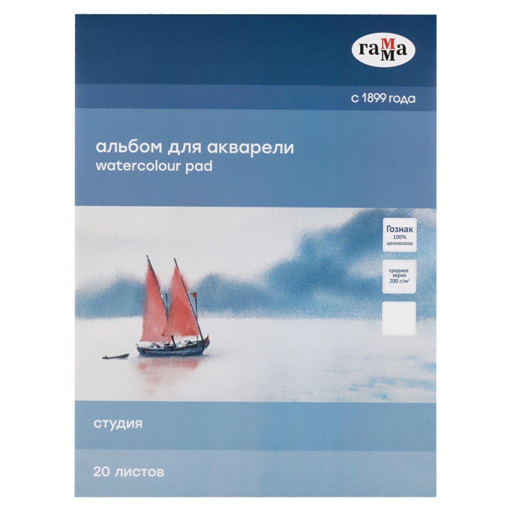 В альбомах Гамма Студия используется бумага Гознак, идеально подходящая для акварели. Выполнена из 100% целлюлозы, плотностью 200г/м2. Бумага хорошо впитывает влагу, не коробится от воздействия воды. Склейка по короткой стороне удобна для аккуратного отрыва. Последняя страница альбома представляет собой твёрдую подложку, служащую в качестве планшета, удобно для работы на пленэрах.