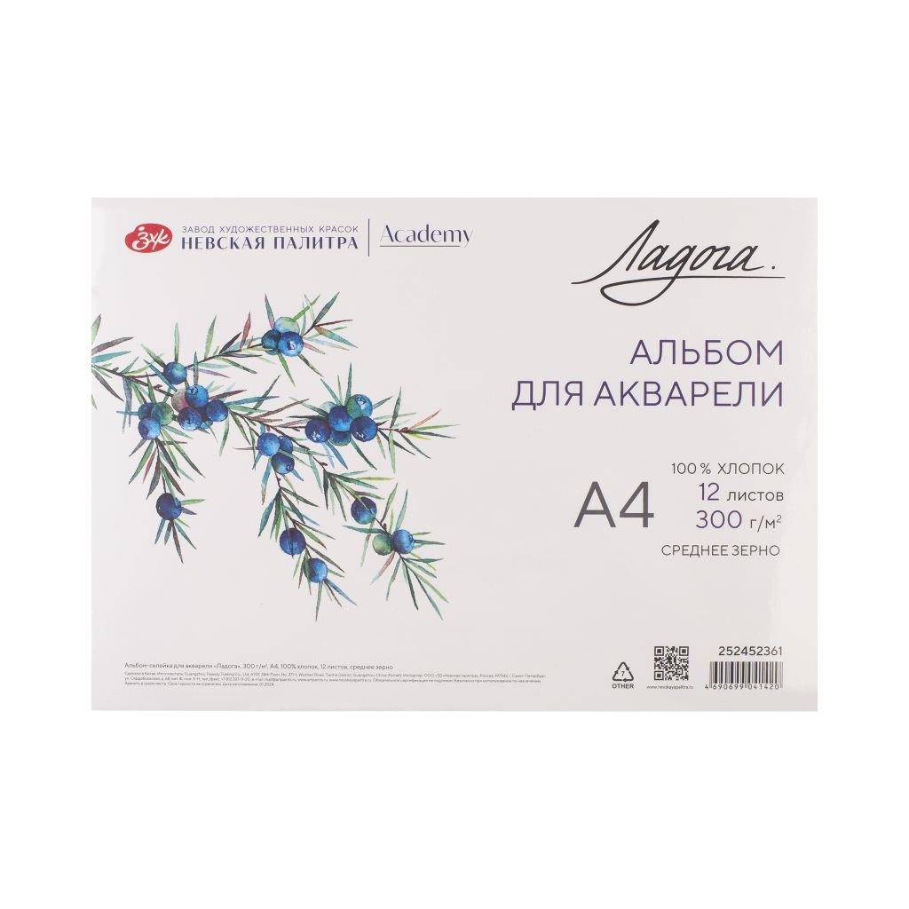 Бумага «Ладога» из 100% хлопка натурального белого цвета прекрасного качества идеально подходит для акварели, а также акварельных карандашей и маркеров, гуаши и акрила, туши, смешанных техник. Акварельная бумага 300 гр/м2 позволяет работать в технике по-сухому и по-мокрому, делать тонкую детализацию, работать в многослойной живописи и лессировках. Бумага проклеена не только в массе, но и на поверхности. Это позволяет делать корректировки, отмывки, быть устойчивой к стираниям. Цвета отлично смешиваются, получаются красивые заливки и градиенты. Краски сохраняют свою насыщенность, звонкость после высыхания. При использовании маскирующих жидкостей или маскировочной ленты их следы удаляются без остатка. Не содержит кислот и хлора. Альбом-склейка проклеена по 4 сторонам, что позволяет комфортно работать, особенно в технике «по-мокрому». Серия представлена альбомами разных форматов.