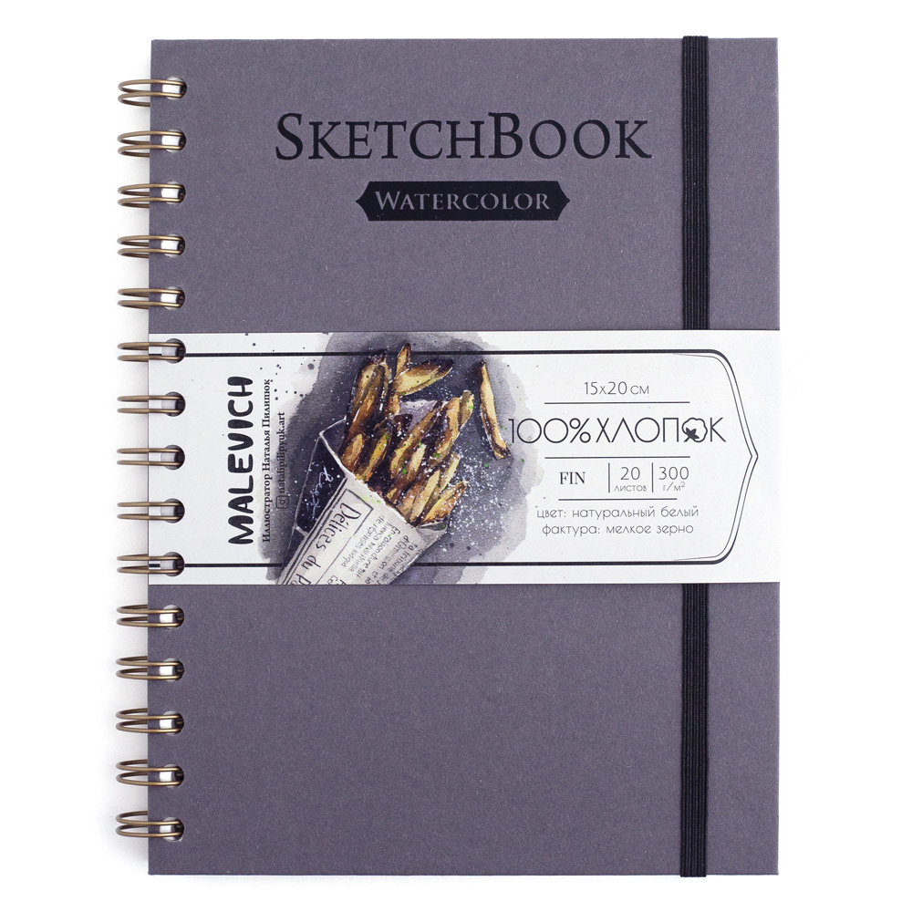 Внутри скетчбука высококачественная бумага плотностью 300 гр/м2, выполненная из 100% хлопка. Бумага обладает мелкозернистой фактурой. Благодаря высокой плотности бумага хорошо смачивается и держит воду, при этом почти не деформируется, высыхает не быстро, позволяя работать в технике по-сырому. На бумаге хорошо получается градиент и растяжка цвета. Во влажном состоянии хорошо вытирается и позволяет внести коррективы. Цвет впитывает не сильно, с учетом, что это хлопок. Серия представлена скетчбуками в обложке разных цветов.