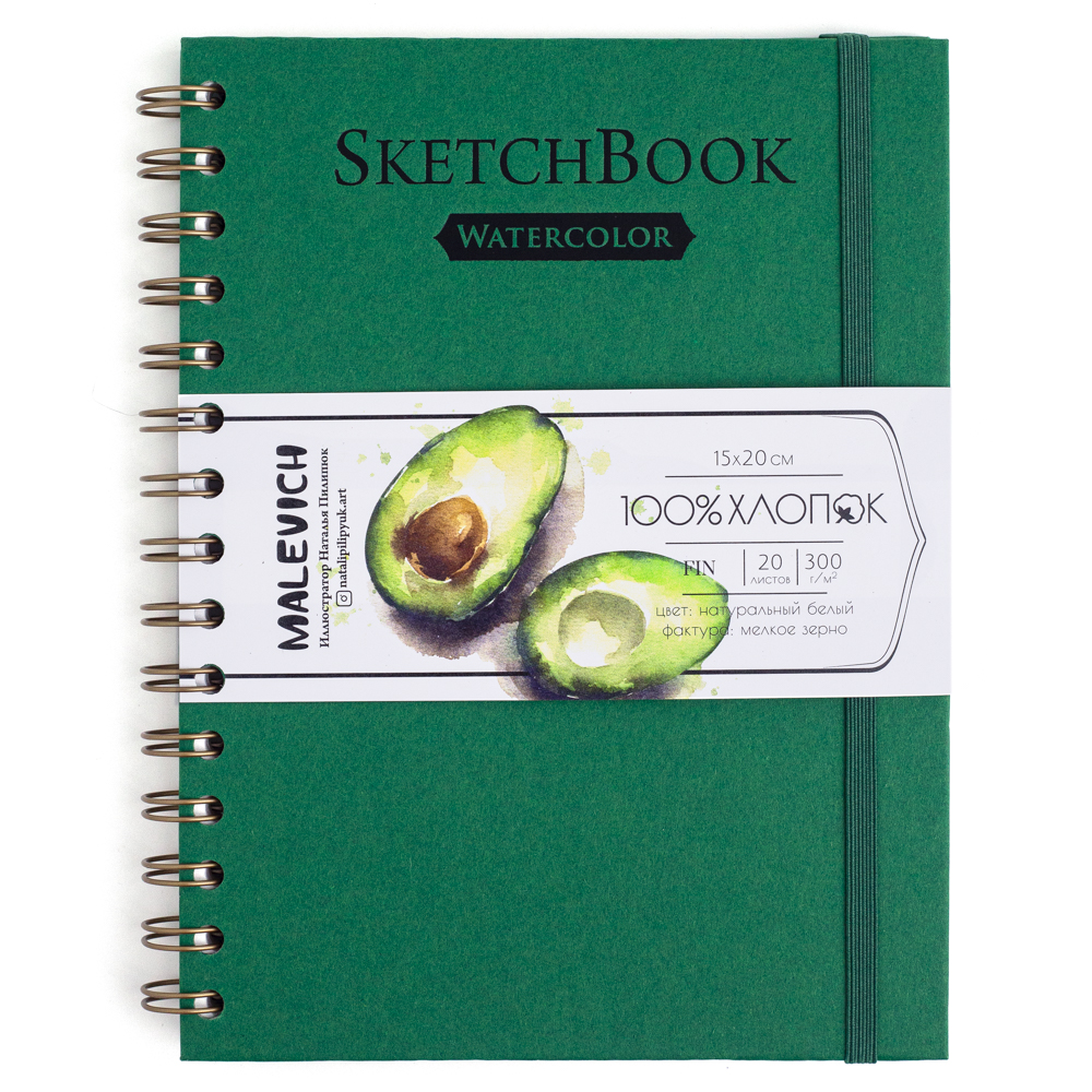 Внутри скетчбука высококачественная бумага плотностью 300 гр/м2, выполненная из 100% хлопка. Бумага обладает мелкозернистой фактурой. Благодаря высокой плотности бумага хорошо смачивается и держит воду, при этом почти не деформируется, высыхает не быстро, позволяя работать в технике по-сырому. На бумаге хорошо получается градиент и растяжка цвета. Во влажном состоянии хорошо вытирается и позволяет внести коррективы. Цвет впитывает не сильно, с учетом, что это хлопок. Серия представлена скетчбуками в обложке разных цветов.