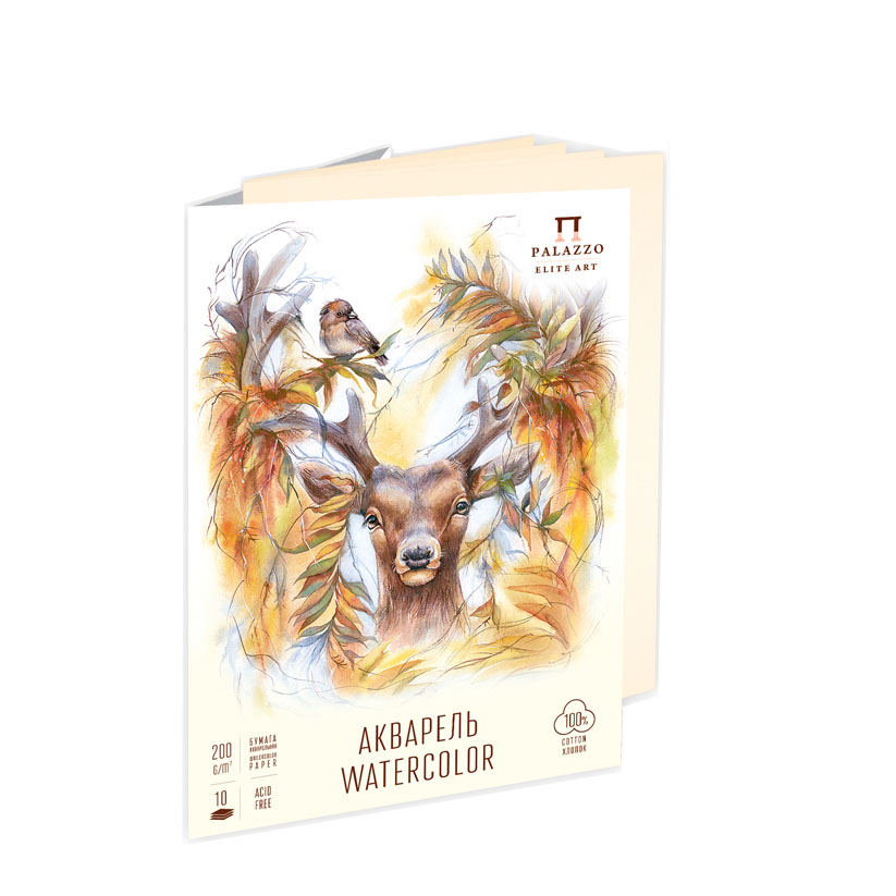 В папке «Король Олень» 10 листов акварельной бумаги цвета слоновой кости и плотностью 200 г/м2, на 100% состоящей из хлопка. Особая композиция хлопковых волокон придает ценные характеристики бумаге: долговечность, закрепление и хорошее впитывание краски, после высыхания она практически не коробится. Приятная текстура зерна получается путем прессования бумаги между шерстяными поверхностями, этот процесс позволяет добиться изящной и изысканной поверхности бумаги. Подходит для разных акварельных техник.