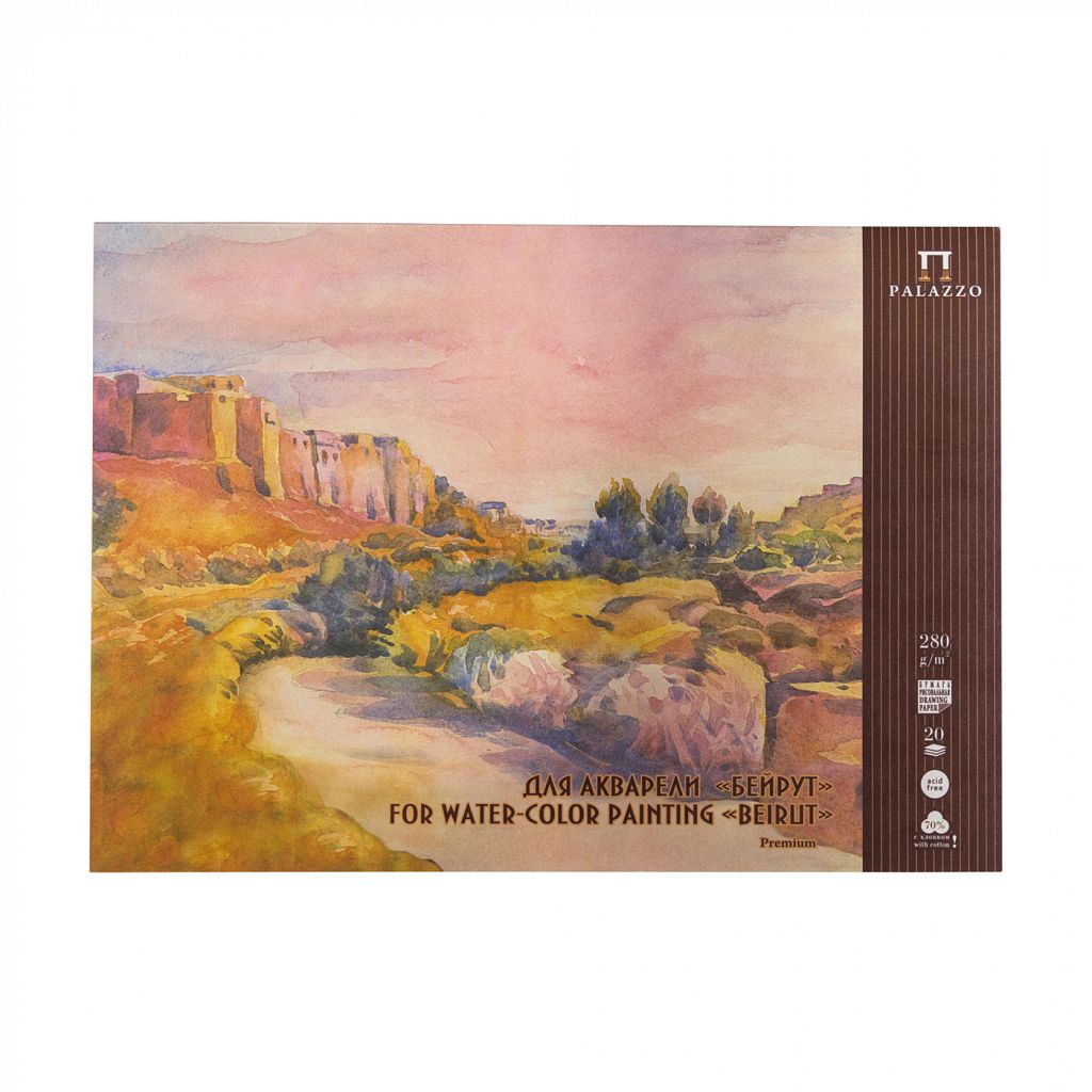 Альбом состоит из 20 листов акварельной бумаги плотностью 280 г/м2. Данная бумага на 70% состоит из хлопка, имеет зернистую поверхность. Наличие хлопка делает работу, написанную на этой бумаге, по-настоящему качественной. Внутренний блок проклеен по корешку с 2-х сторон и имеет основание из жесткого картона для удобства рисования.