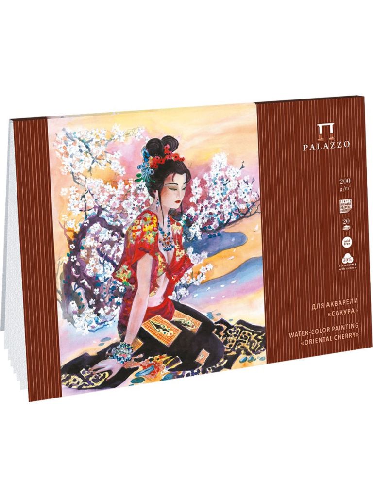 Бумага в планшете "Сакура" состоит на 50% из хлопка, имеет плотность 200 гр/м2 и зернистую поверхность. Наличие хлопка делает работу, написанную на такой бумаге, по-настоящему качественной, краски очень хорошо ложатся на ее поверхность.