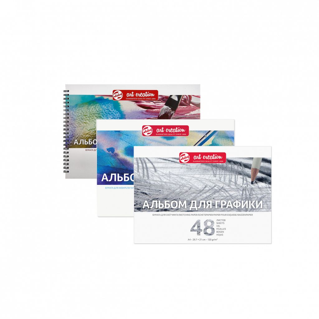 Альбомы для акварели Talens Art Creation разработаны специально для выполнения работ красками на водной основе. Для изготовления альбома использована мелкозернистая чистоцеллюлозная бумага. Отсутствие лигнина и кислот в бумажной массе делает бумагу устойчивой к воздействию времени. Плотность бумаги 200 г/м2. Альбомы для графики Talens Art Creation разработаны специально для работы сухими графическими материалами. В альбоме использована чистоцеллюлозная бумага без добавления кислот и оптических отбеливателей. Бумага естественно-белого цвета плотностью 120 гр/м2. Альбомы для смешанных Talens Art Creation разработаны для работы как сухими графическими материалами, так и различными видами красок. В альбоме использована чистоцеллюлозная бумага без добавления кислот и оптических отбеливателей. Бумага естественно-белого цвета плотностью 235 гр/м2. Применение: для работ в различных техниках живописи. Производство: производится в городе Апелдорн голландской компанией ROYAL TALENS, которую основал Мартин Таленс (Marten Talens) в 1899 году. ROYAL TALENS производит все виды художественных красок и является одним из ведущих производителей в своей отрасли.