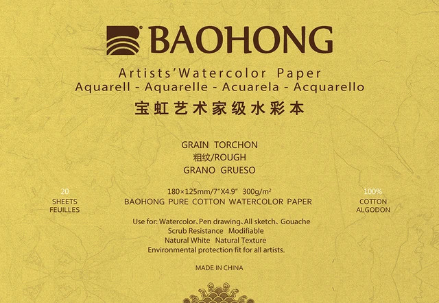 О товаре: внутри альбома Baohong S8 акварельная бумага выполненная из 100% хлопка без применения кислот и отбеливателей. Бумага обладает естественным белым цветом и крупнозернистой фактурой. Плотность бумаги 300 гр/м2 позволяет работать акварелью в любых техниках, в том числе "по-мокрому". Запатентованные методы обработки бумаги Baohong обеспечивают высокую насыщенность цвета даже после высыхания красок. Применение: для художественных работ акварелью и другими красками на водной основе. О бренде: изготавливается под брендом Baohong на фабрике по производству специализированной и художественной бумаги в Китае. Фабрика была основана в 1992 году и в настоящее время имеет множество запатентованных разработок бумаги различного типа — от эскизной до цифровой художественной бумаги для печати. Профессиональное качество, строгие технологии и широкая адаптивность обеспечивают высокие стандарты специализированной бумаги бренда Baohong для самых различных работ.